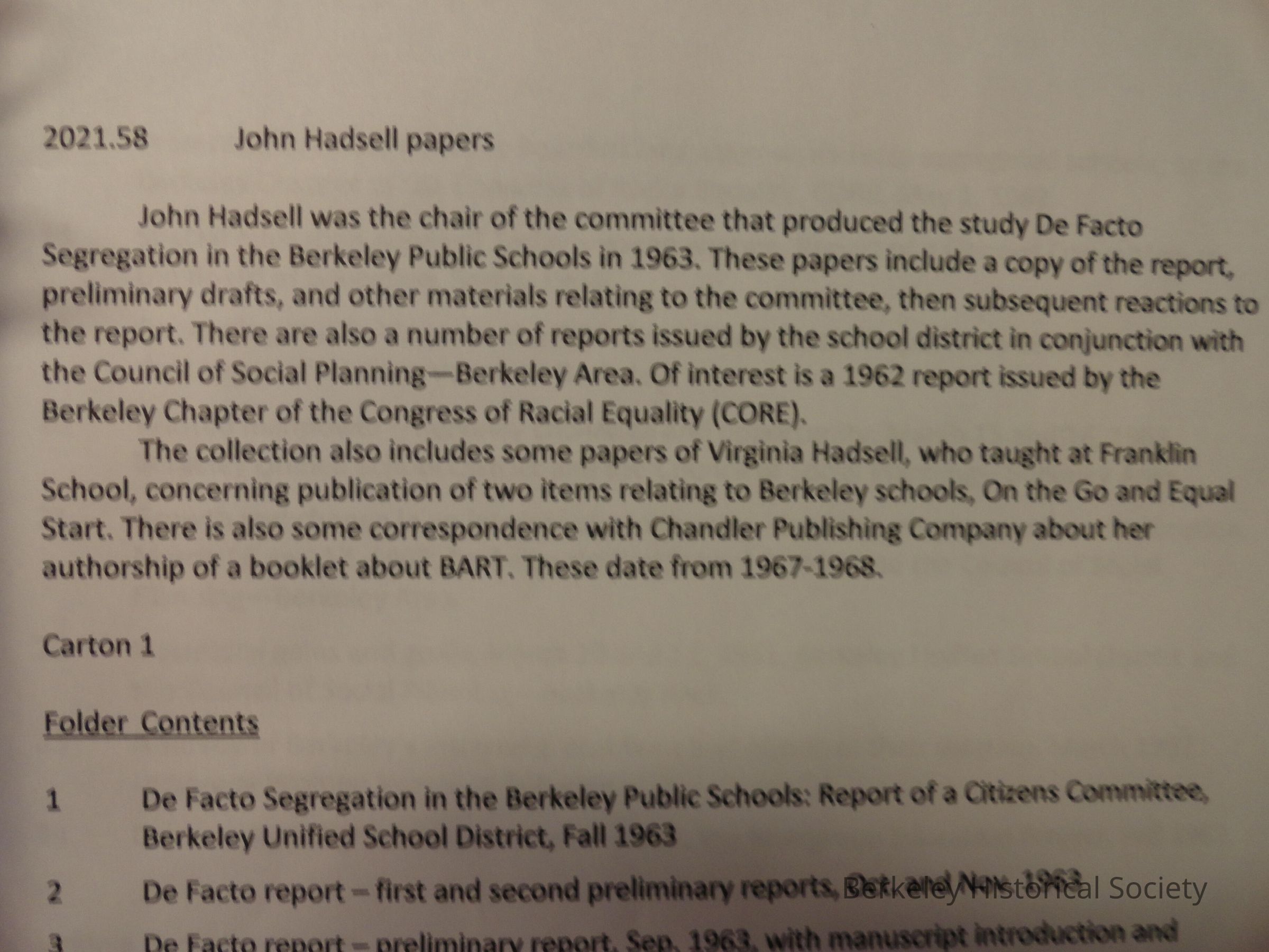 John Hadsell was the chair of the committee that produced the study De Facto Segregation in the Berkeley Public Schools in 1963. These papers include a copy of the report, preliminary drafts, and other materials relating to the committee, then subsequent reactions to the report. There are also a number of reports issued by the school district in conjunction with the Council of Social Planning—Berkeley Area. Of interest is a 1962 report issued by the Berkeley Chapter of the Congress of Racial Equality (CORE).