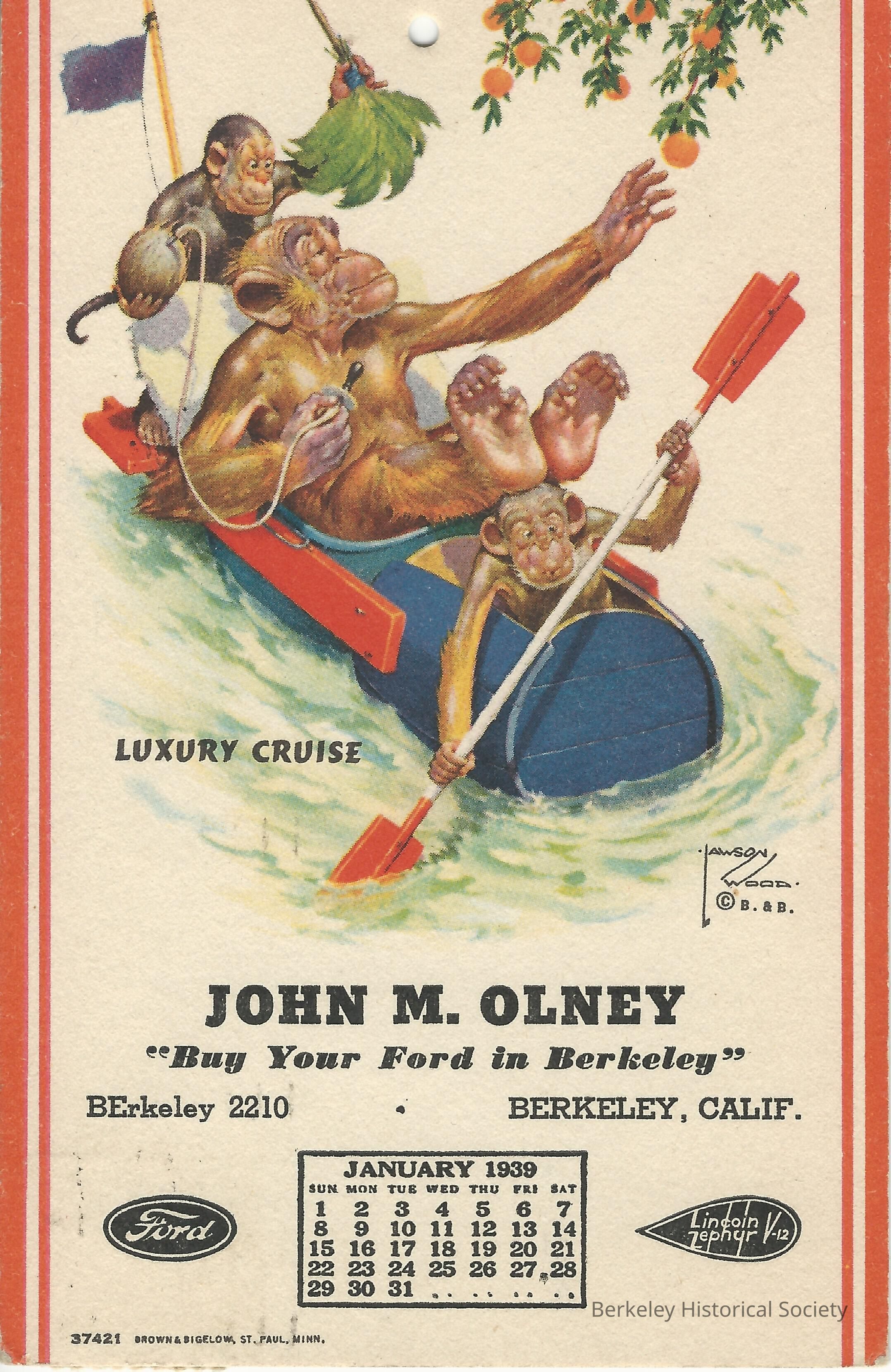 Divided back advertising postcard for John M. Olney Ford dealership of Berkeley. Illustration is "Luxury Cruise" depicting three monkeys on a sort of kayak, one rowing, one serving the master seated in the middle. Printed New Years message on back. Calendar for January 1939 at bottom of card.Made/Created