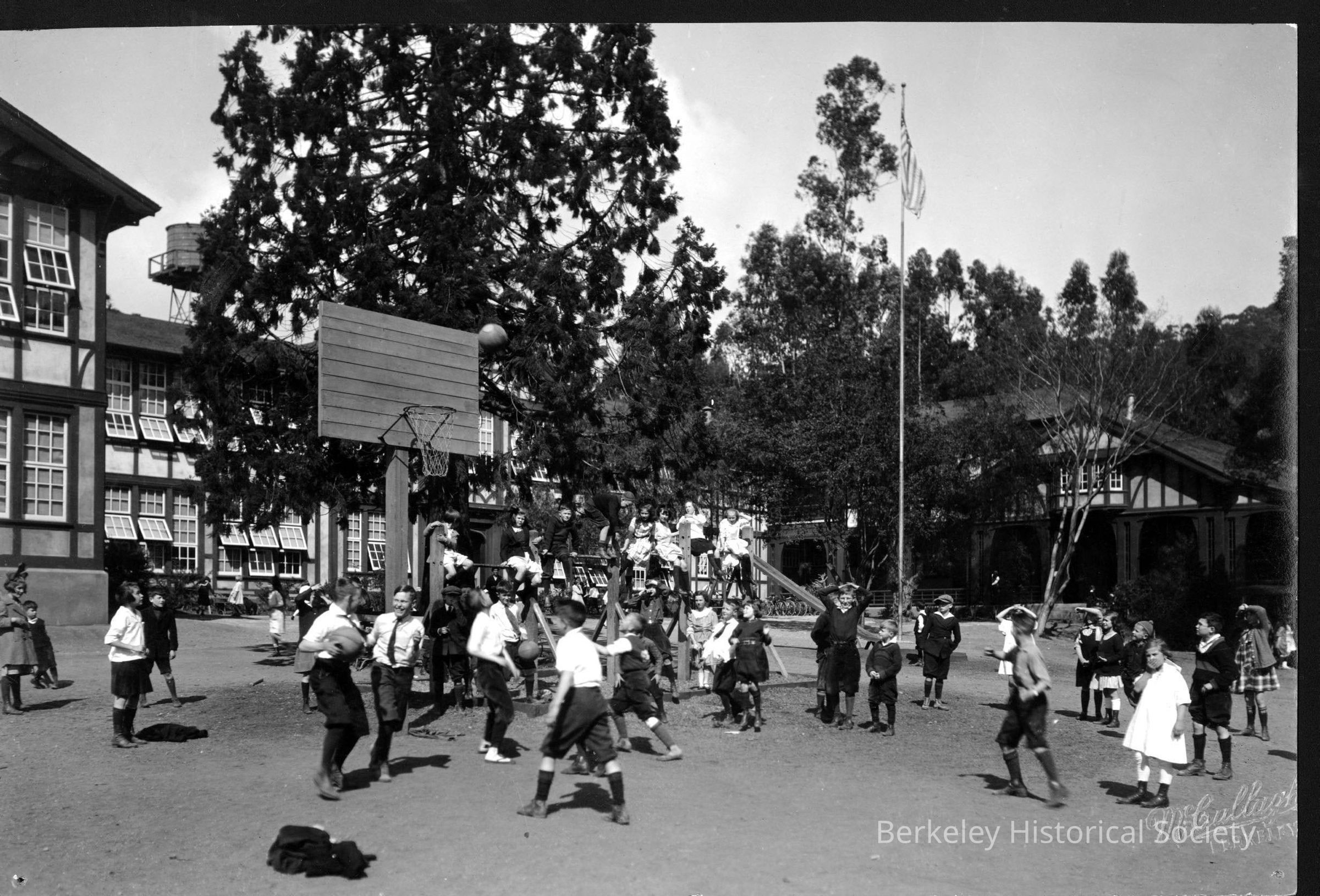 Students in play yard, some playing basketball.