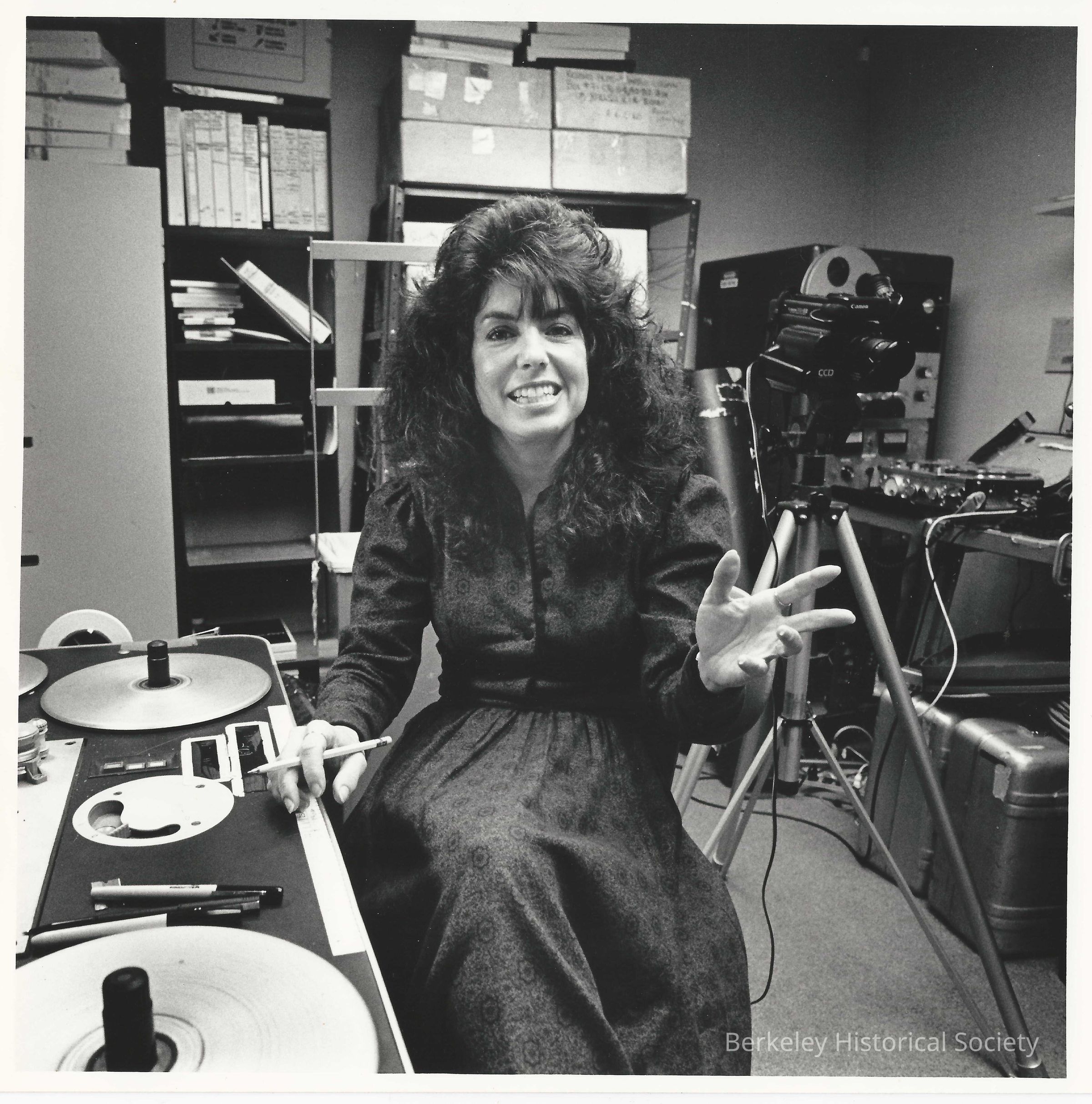 Seated in front of a large tape machine. Undated.