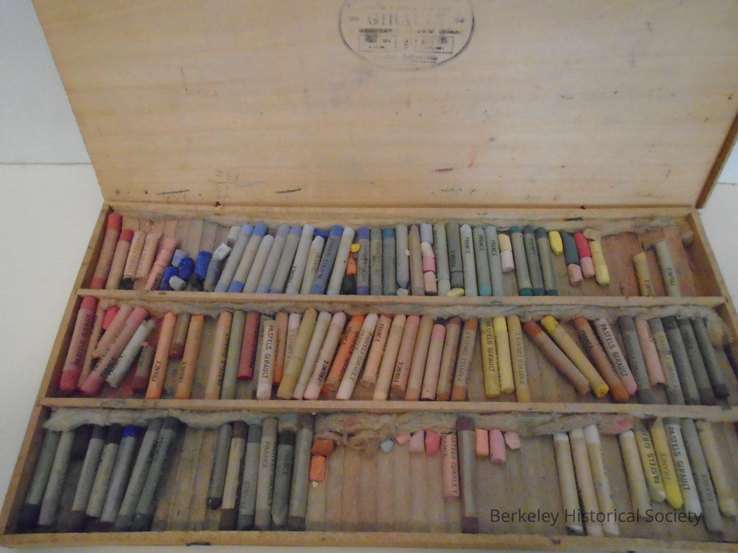 Flat, lightweight wooden box with wire hinges used by Julia Morgan. Contains three parallel trays lined with corrugated paper and grey fibrous packing material. Artist's chalk pastels fit inside each paper corregation. About 1/2 filled. Covered with a layer of fibrous packing material. Inside cover has manufacturer's information & name stamped on it "Girault" , a paper label "Distributed by Duncan, Vail Co., Los Angeles" and some penciled numbers. On the outside of the box on the lid is a small stamp "made in France".