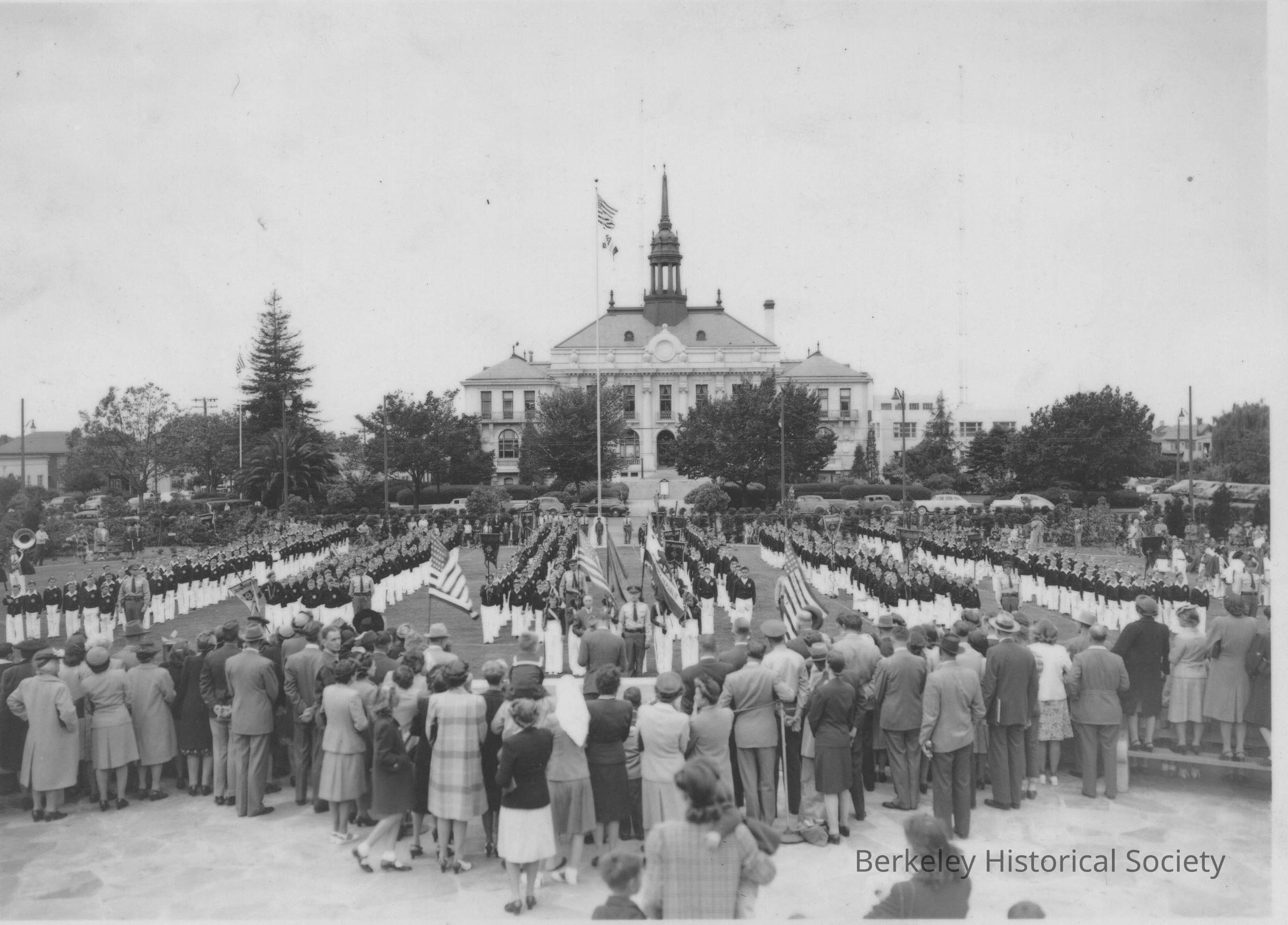 Many participants standing in formation in Civic Center park; onlookers in foreground, city hall in background.Other Names and Numbers