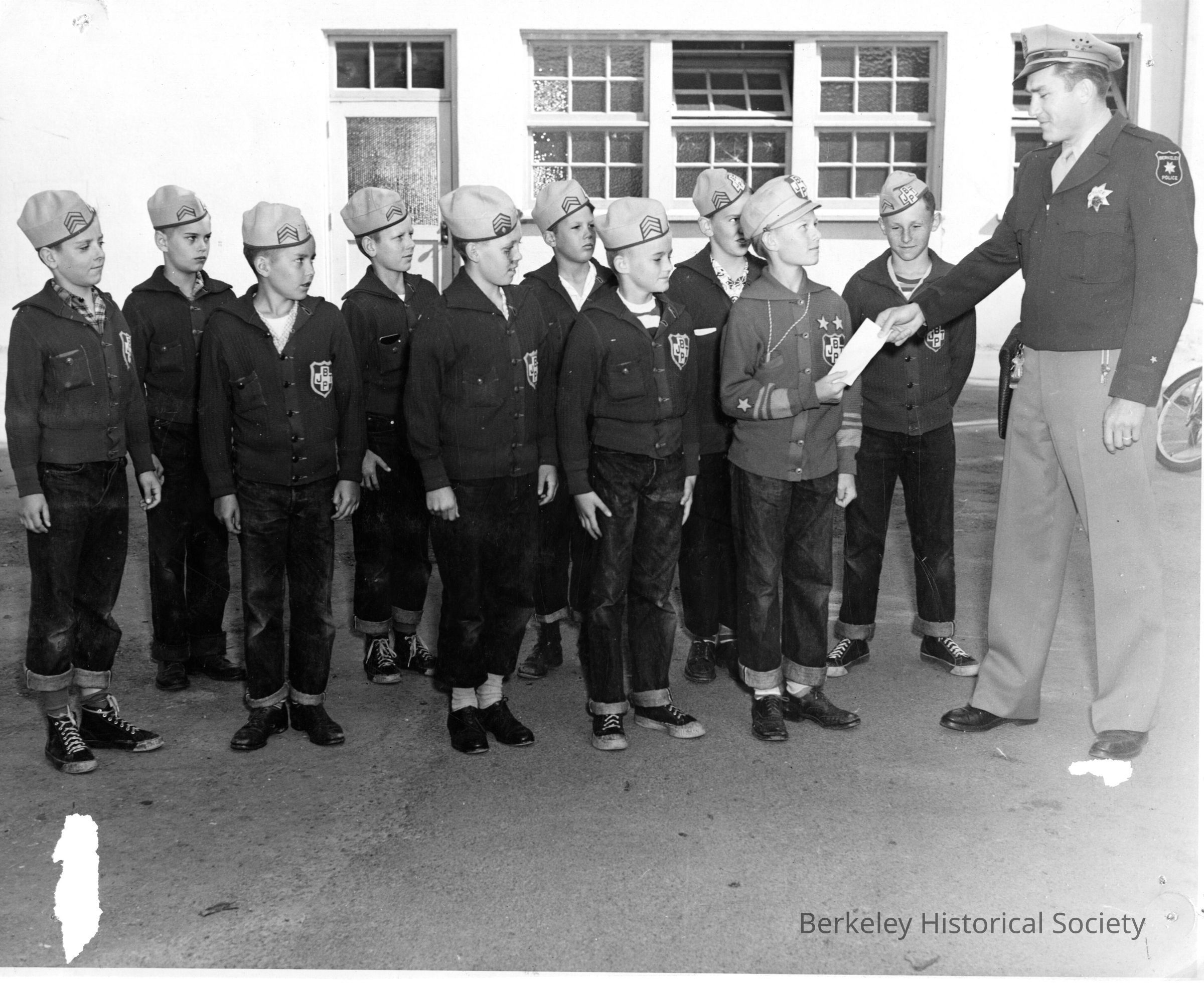 Group of boys at Thousand Oaks PRimary; Police office handing paper to one of boys. Paul Hunych.Other Names and Numbers