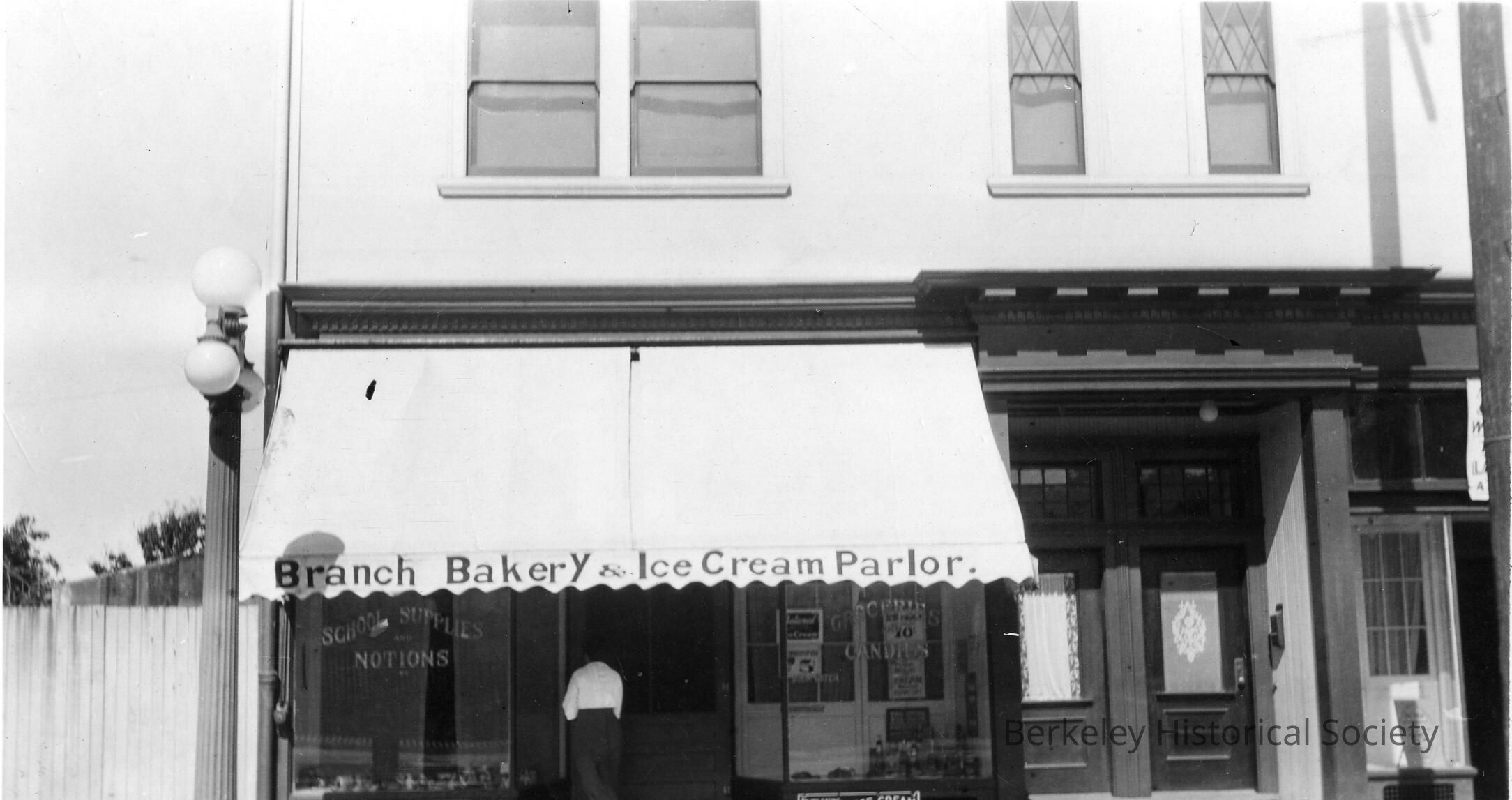 Awning has lettering: Branch Bakery - Ice Cream Parlor. Located at 1675 Shattuck Avenue.Other Names and Numbers