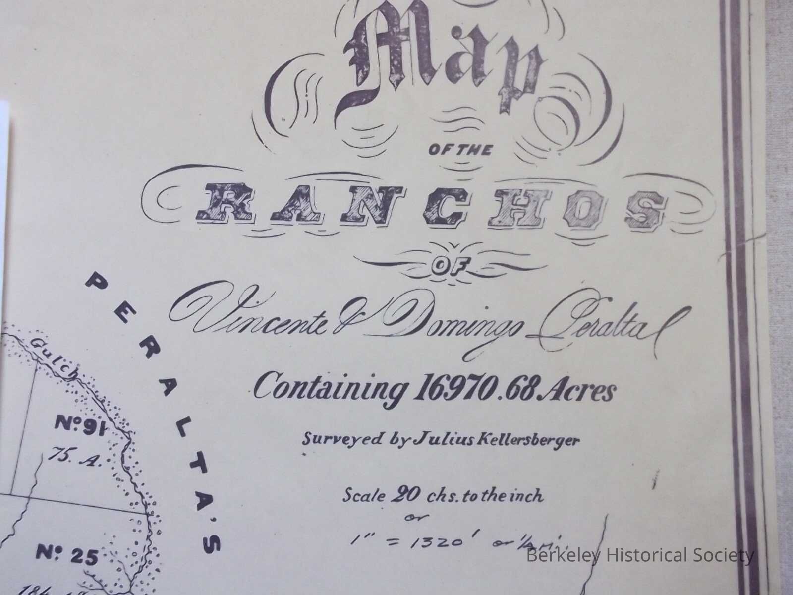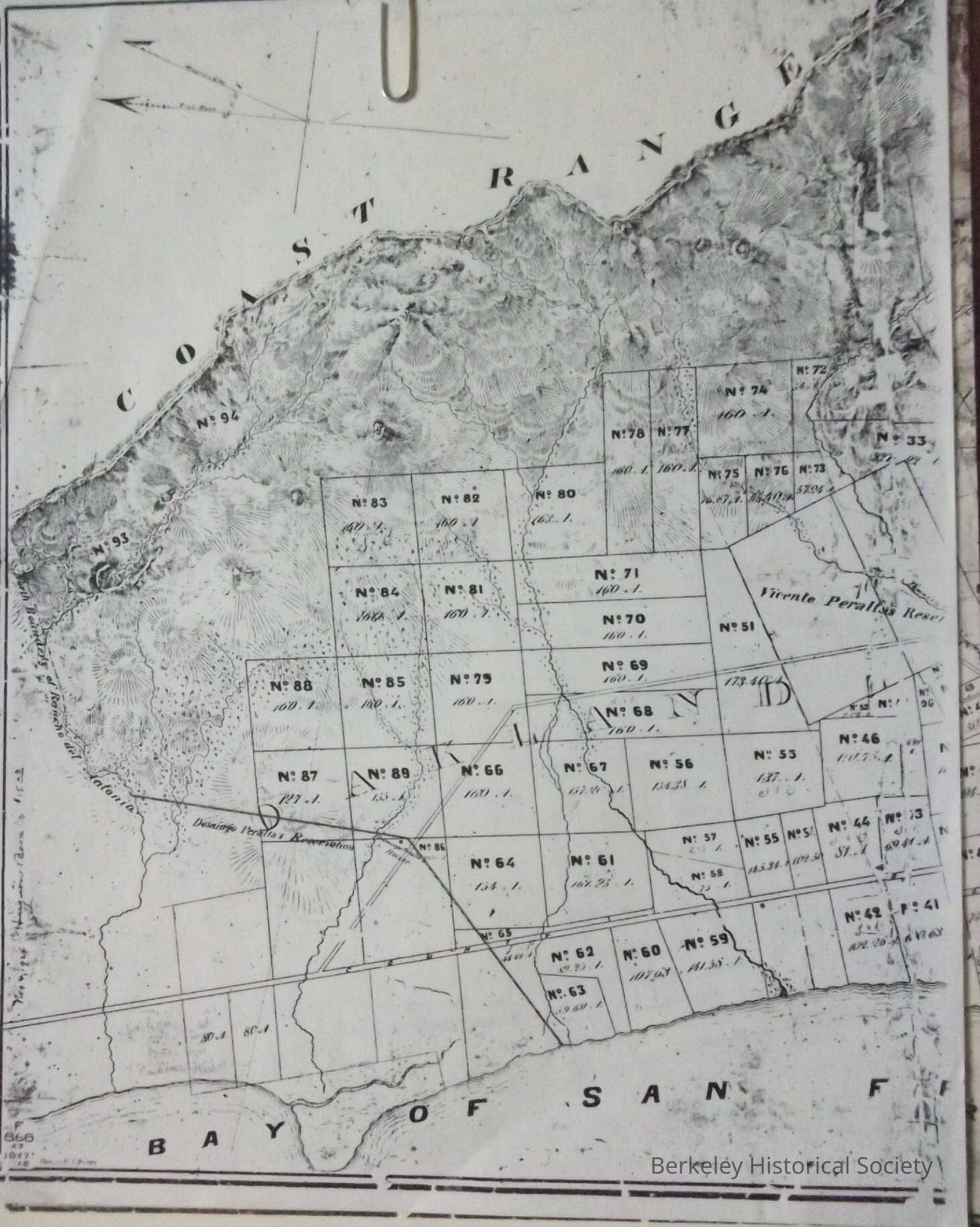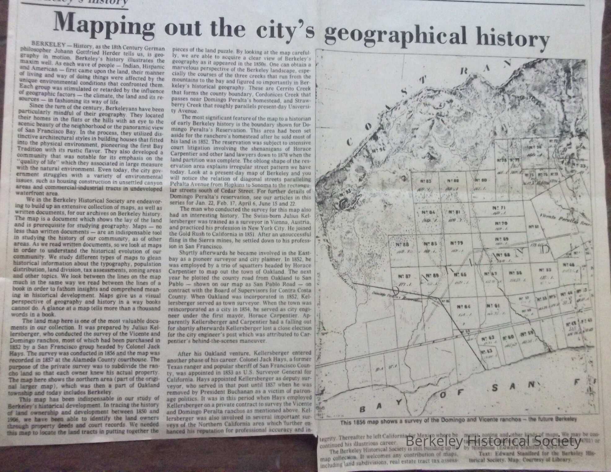 Full map showing Berkeley, Oakland,; several small sizes. Also a copy of map as printed in Berkeley Gazette July 4, 1980 which included narrative of mapping history by Edward Staniford. This document basis for all streets patterns in Berkeley, excepting the HillsLexicon