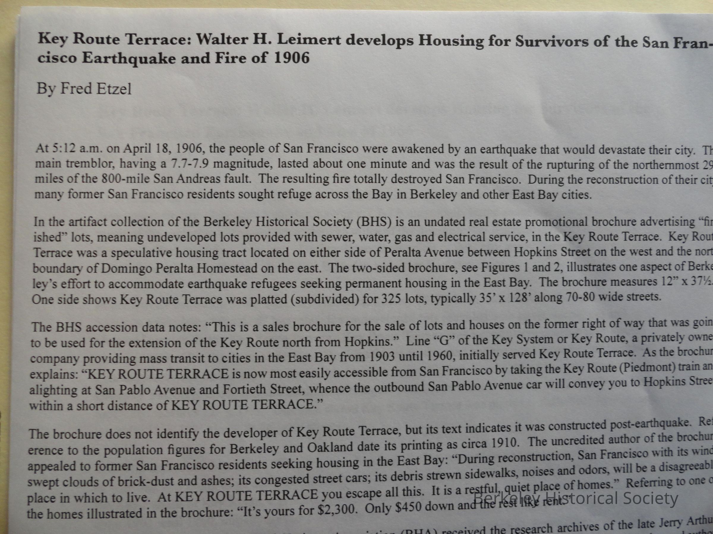 Essay, with reproduction of photo of Leimert and of advertising brochure for the development with maps and other illustrations.
