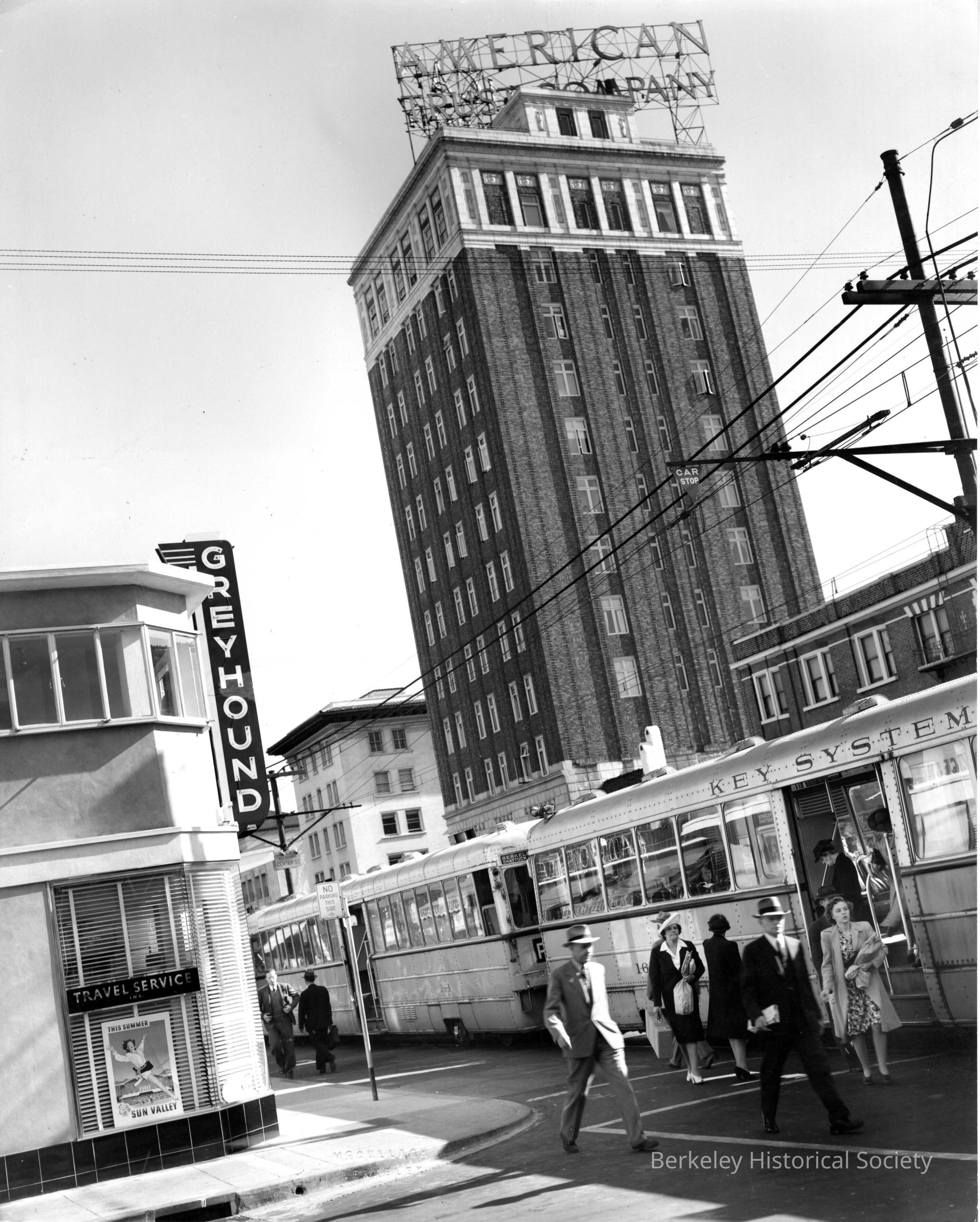 Key System train in front of Greyhound, 1942 Berkeley Square, Shattuck