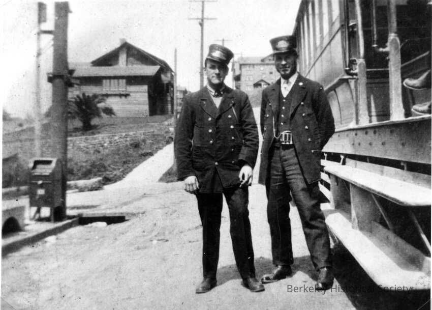 Key System, 1905. Two crew members standing by side of car. Euclid & Hilgard
