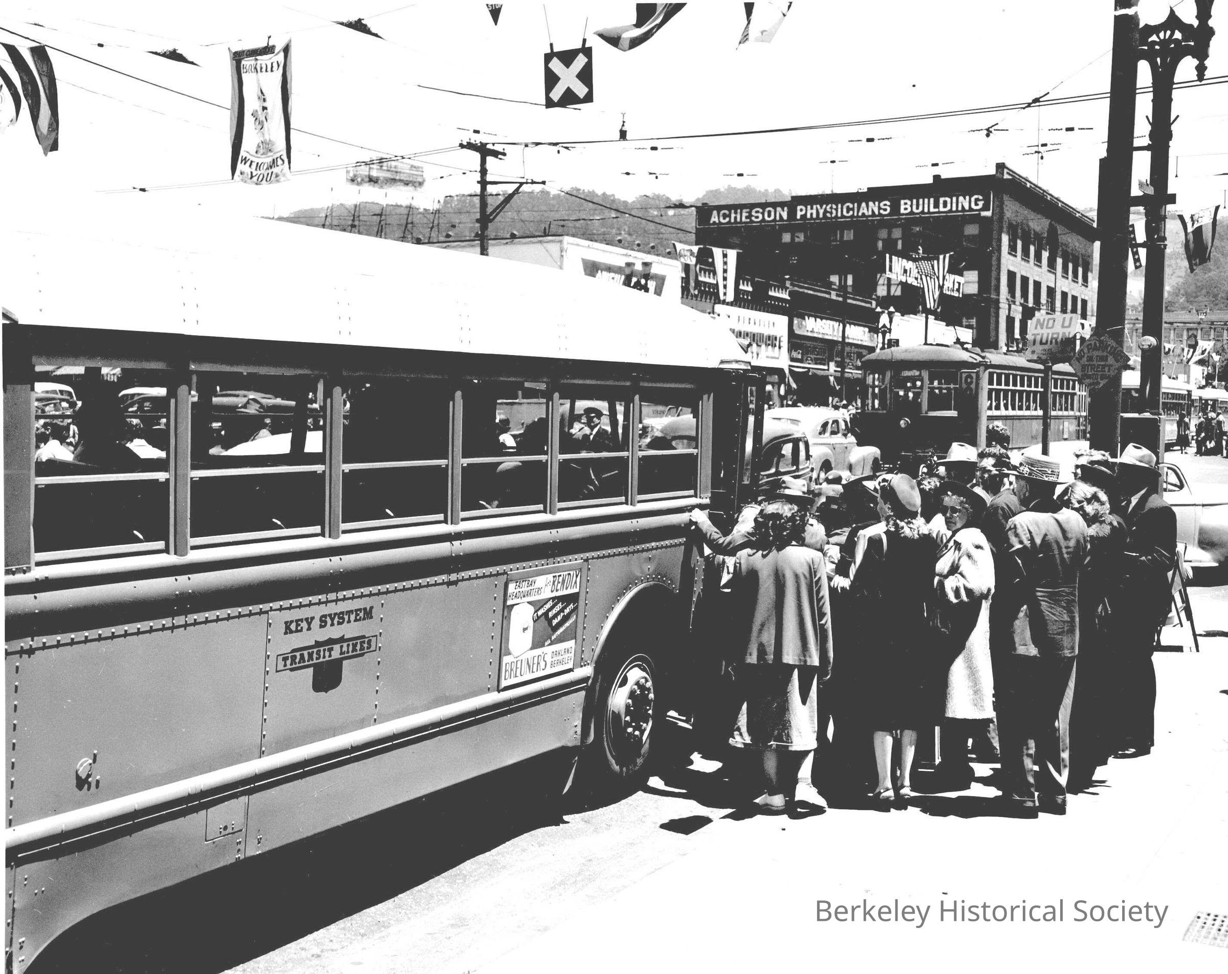 Passengers boarding key system bus/streetcars, 1947.