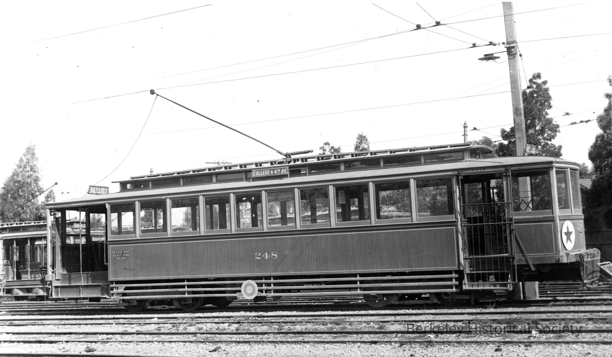 Side view of empty car 248. Destination sign: College & 4th Av. Unidentified location.