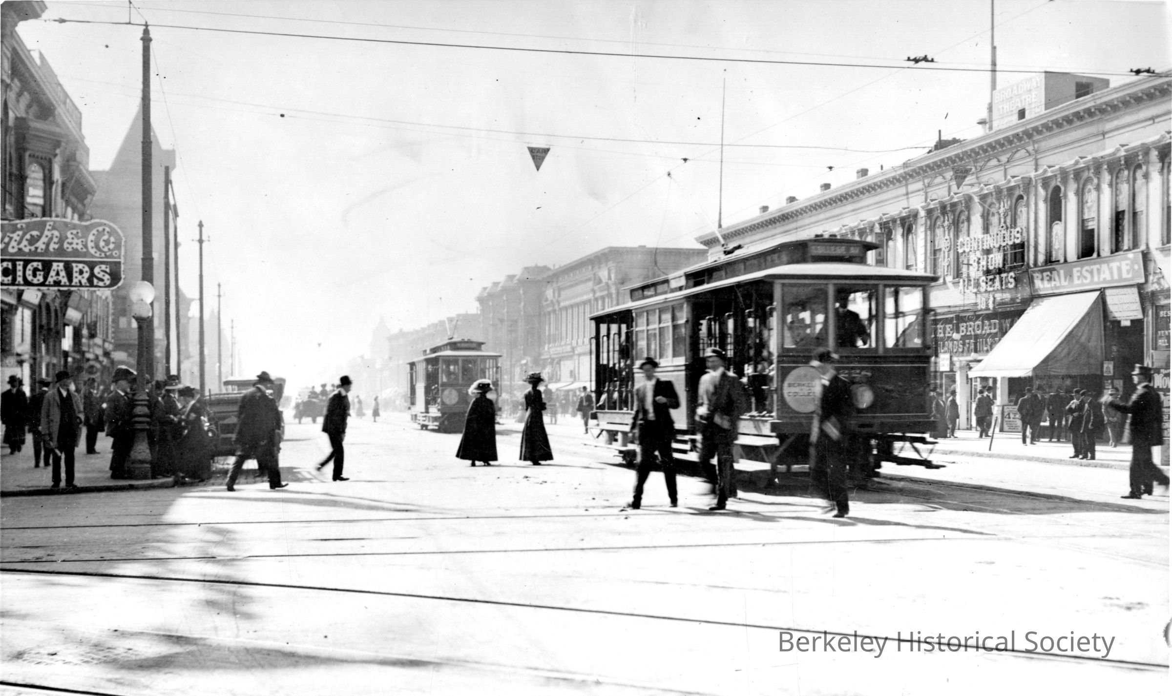 Car 228 at 12th and Broadway, Oakland; pedestrians crossing street.