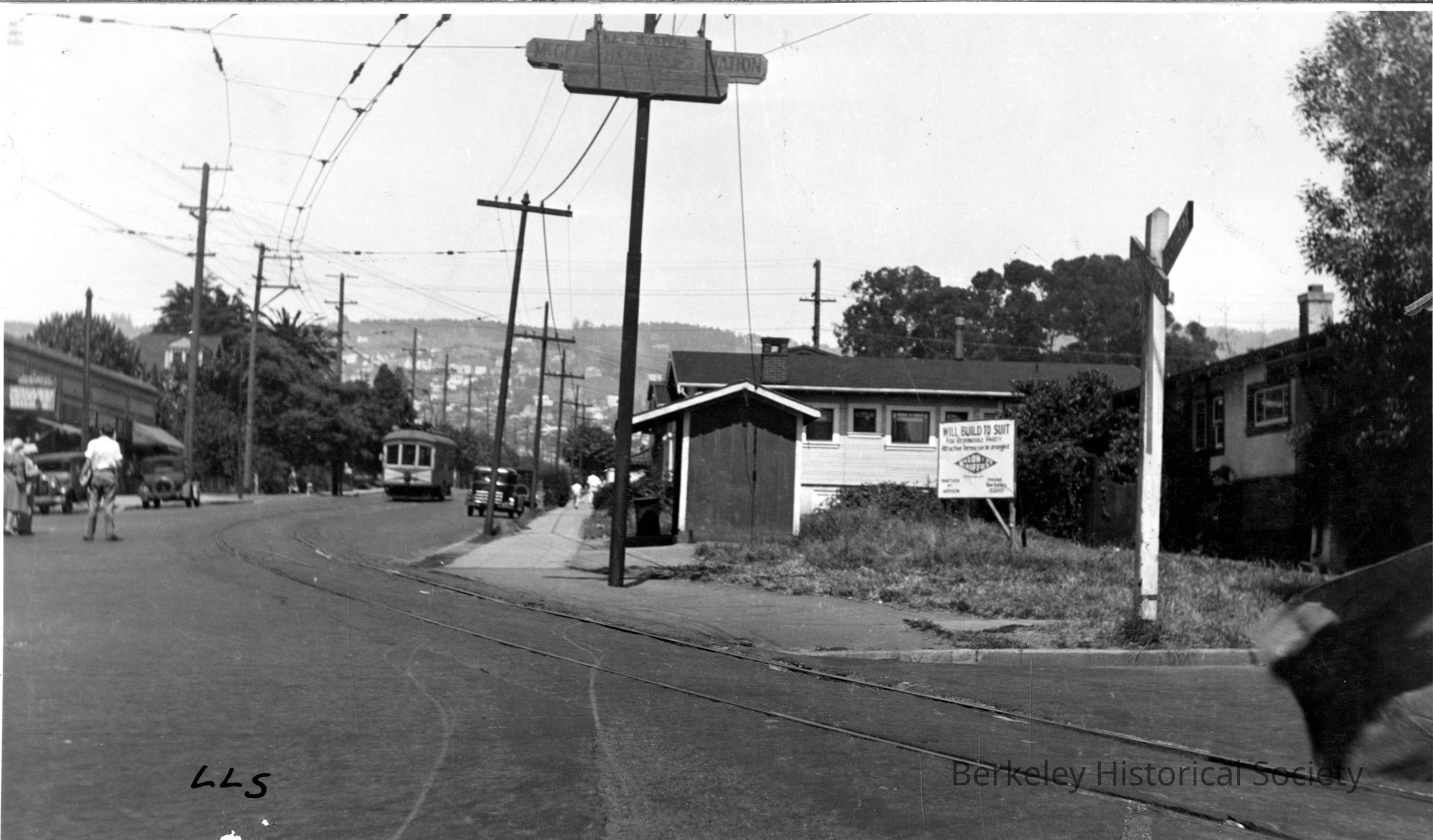 Streetcar coming down Hopkins Street to McGee; people waiting for car.