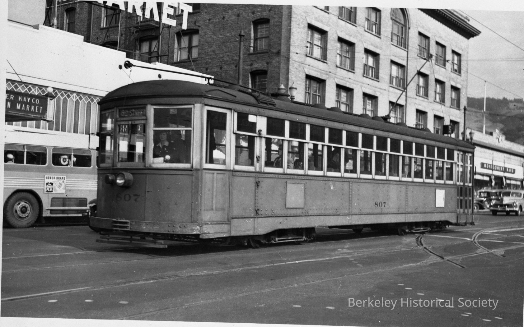 Car 708 heading west on University Avenue east of Shattuck Avenue. Acheson Building behind streetcar.