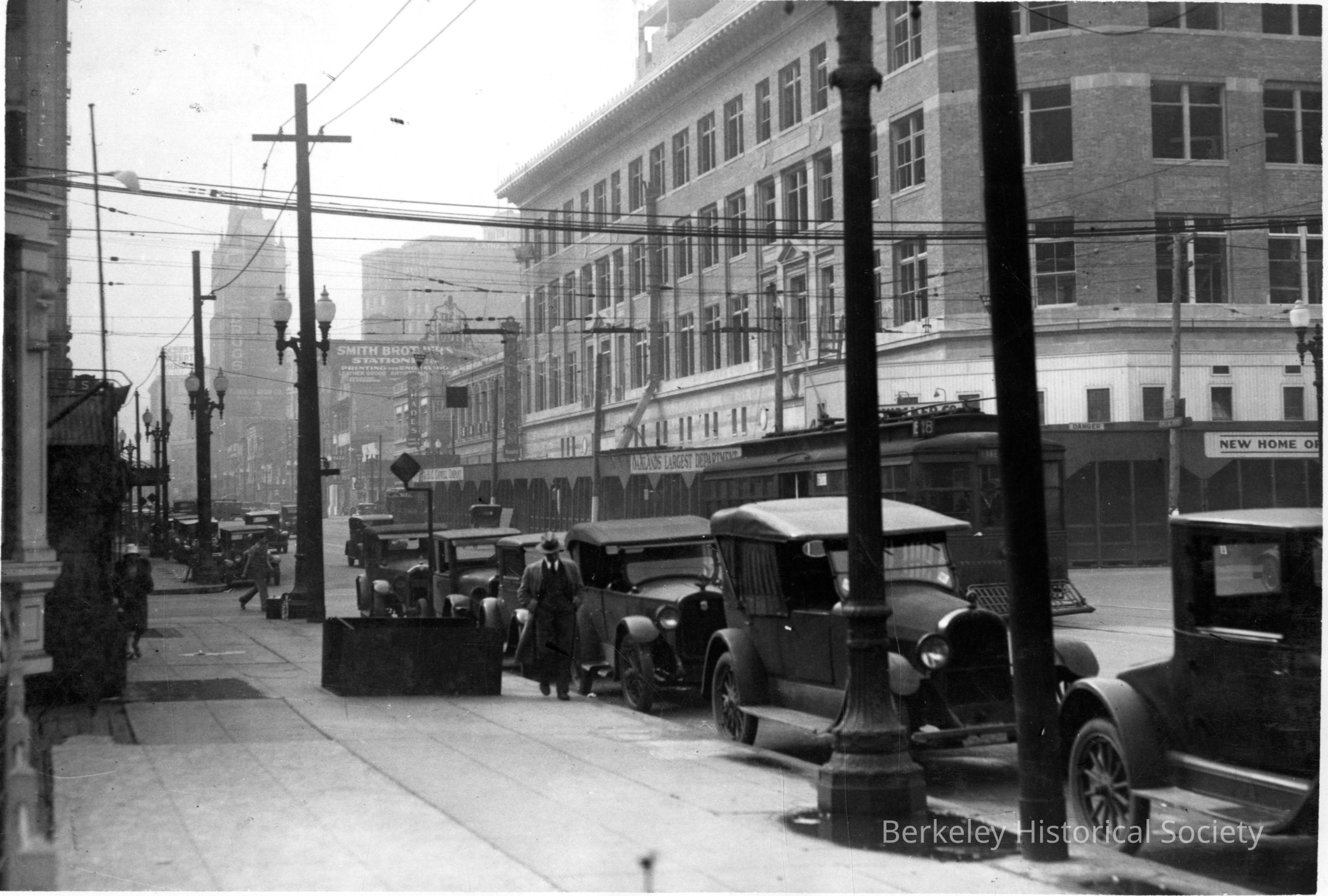 Streetcar City class 700 on Broadway near 18th Street, Oakland., visible over parked cars.