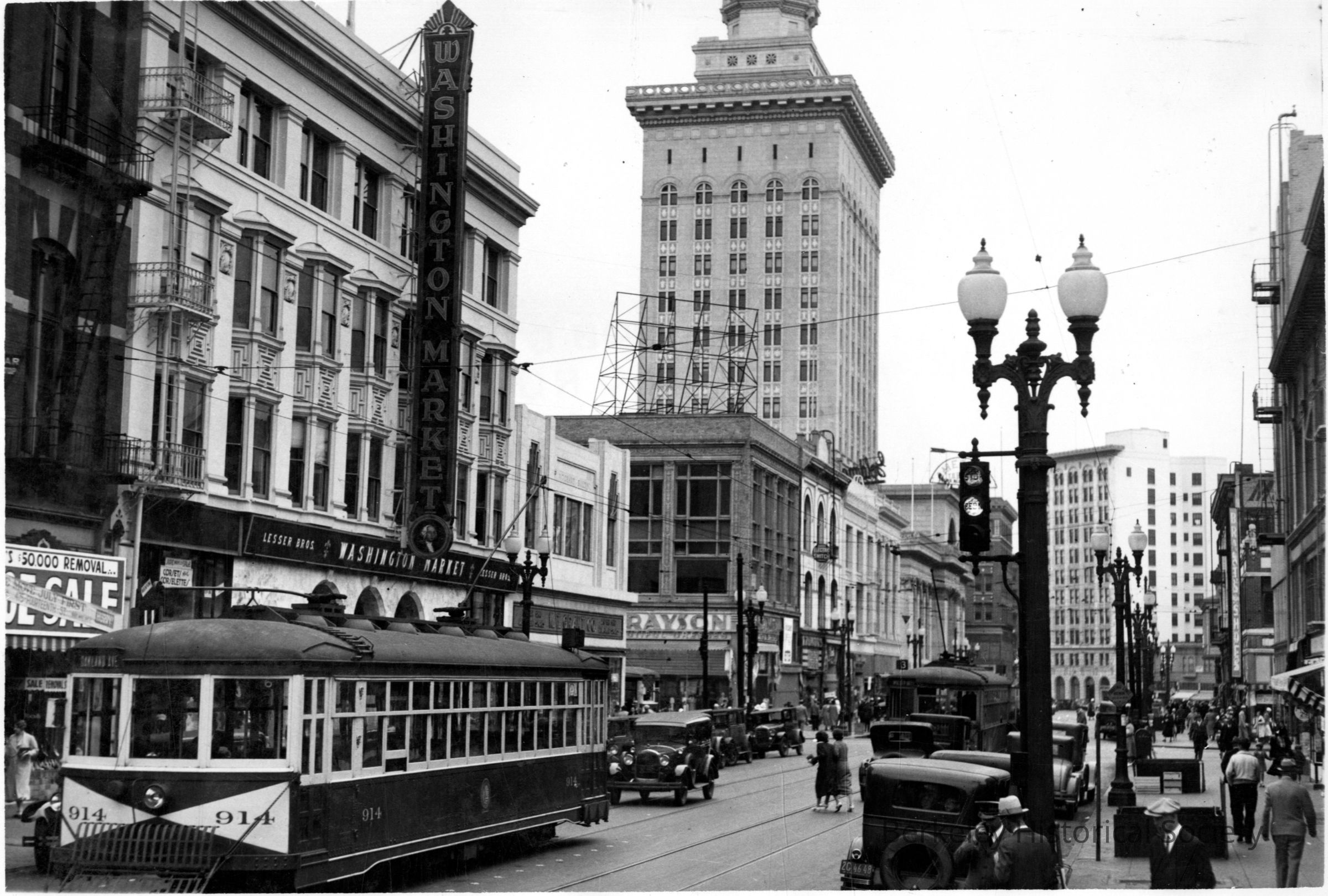 Streetcar on Washington Street, Oakland. Sign for Washington Market; Tribune Tower in background.