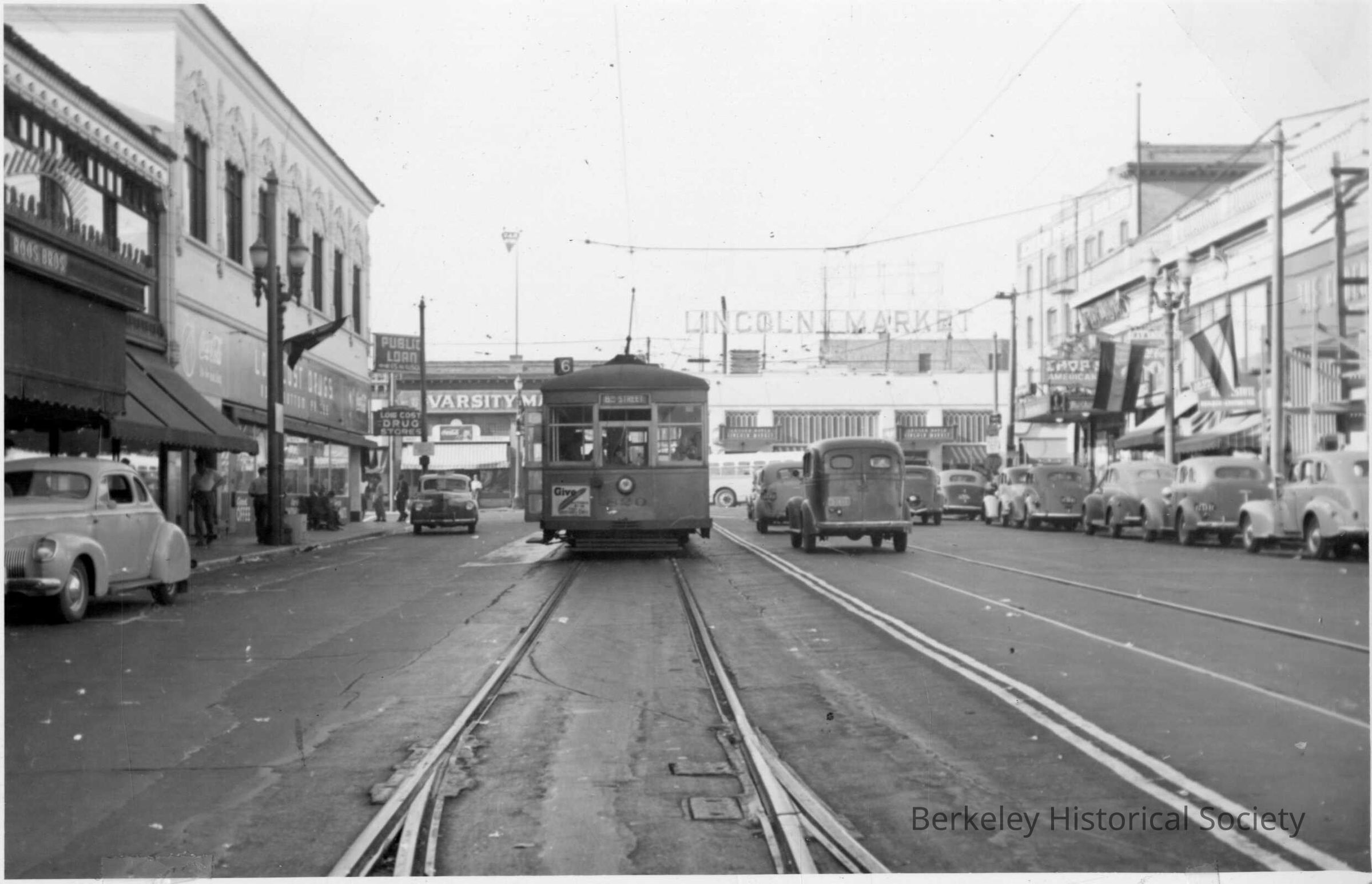 Key System Streetcar #6, 1940 Varsity Market and Lincoln Market on University Avenue