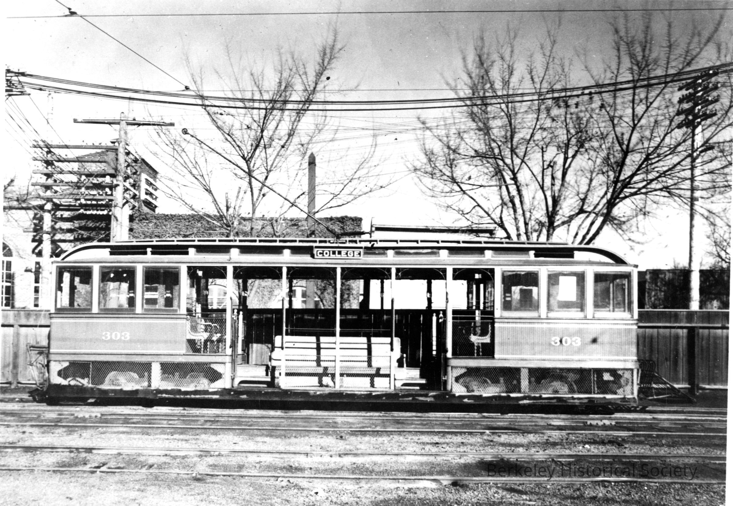 Side view of empty car 303. Destination sign: College. Unidentified location; Temescal Carhouse?