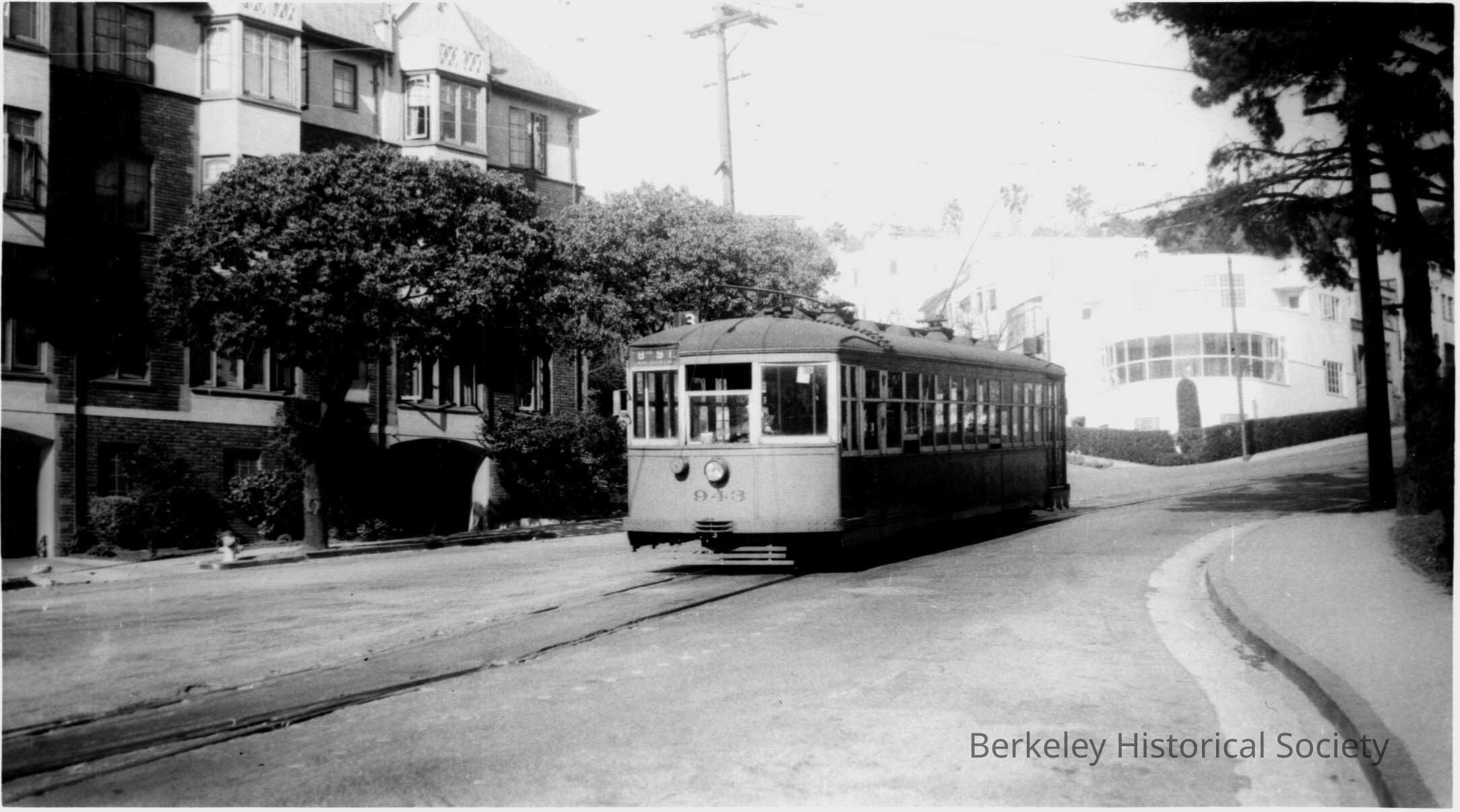 Key System Streetcar 943 Hearst approaching Le Conte. Joseph W. Harris house in background.