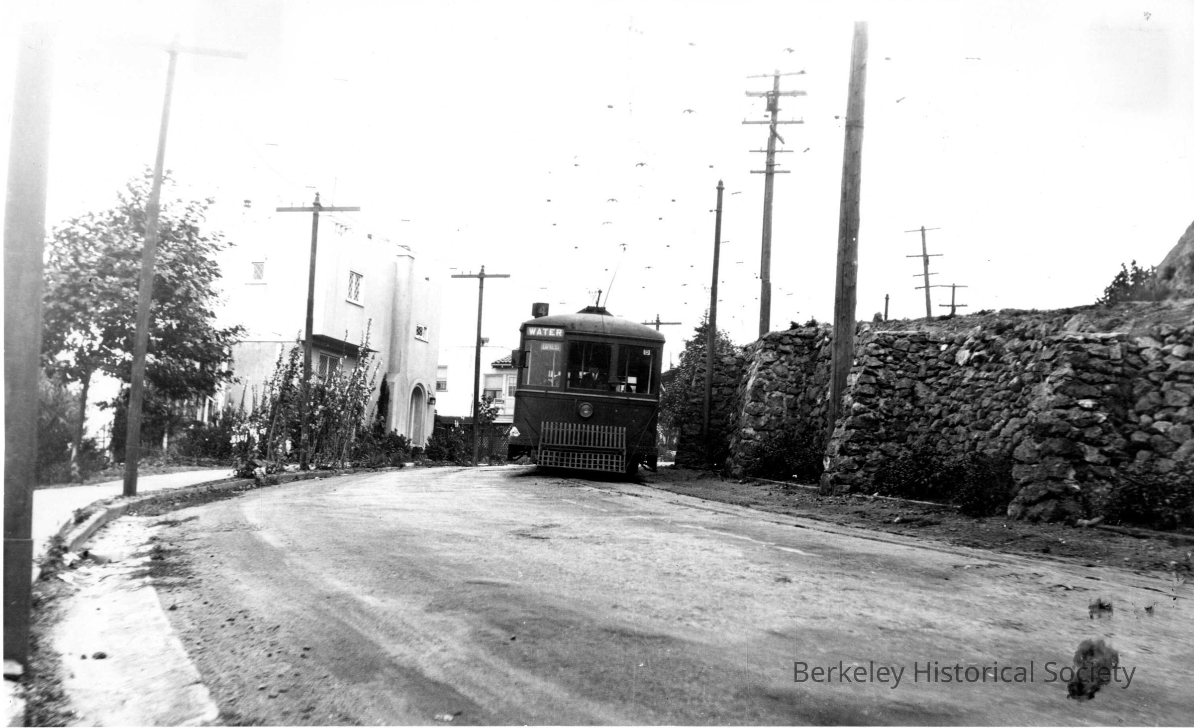 Key Systyem 900, 1927. Euclid between Bred Harte Path and Crystal Way. Stone retaining wall between upper and lower sides of road undulates around telephone poles.