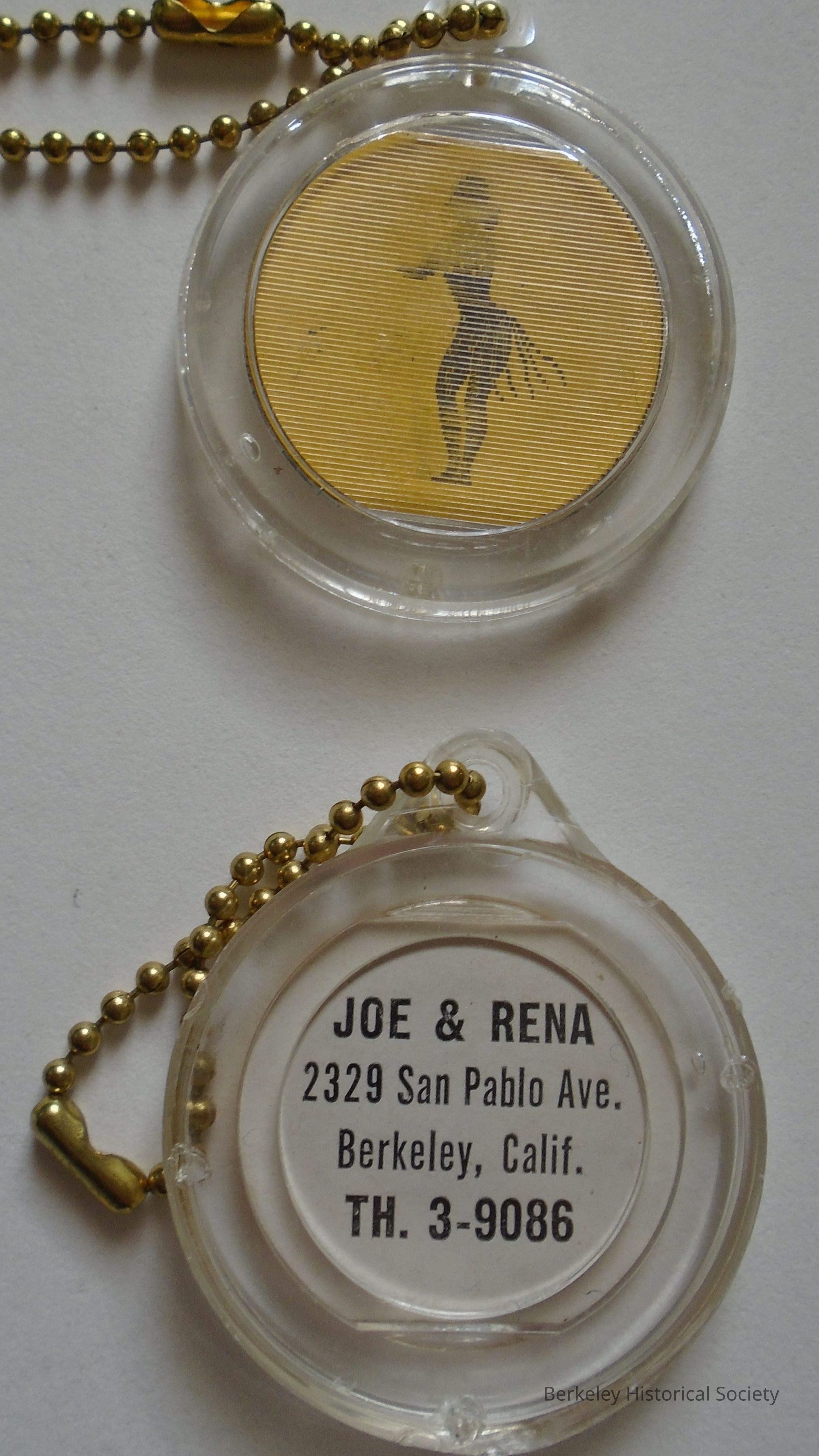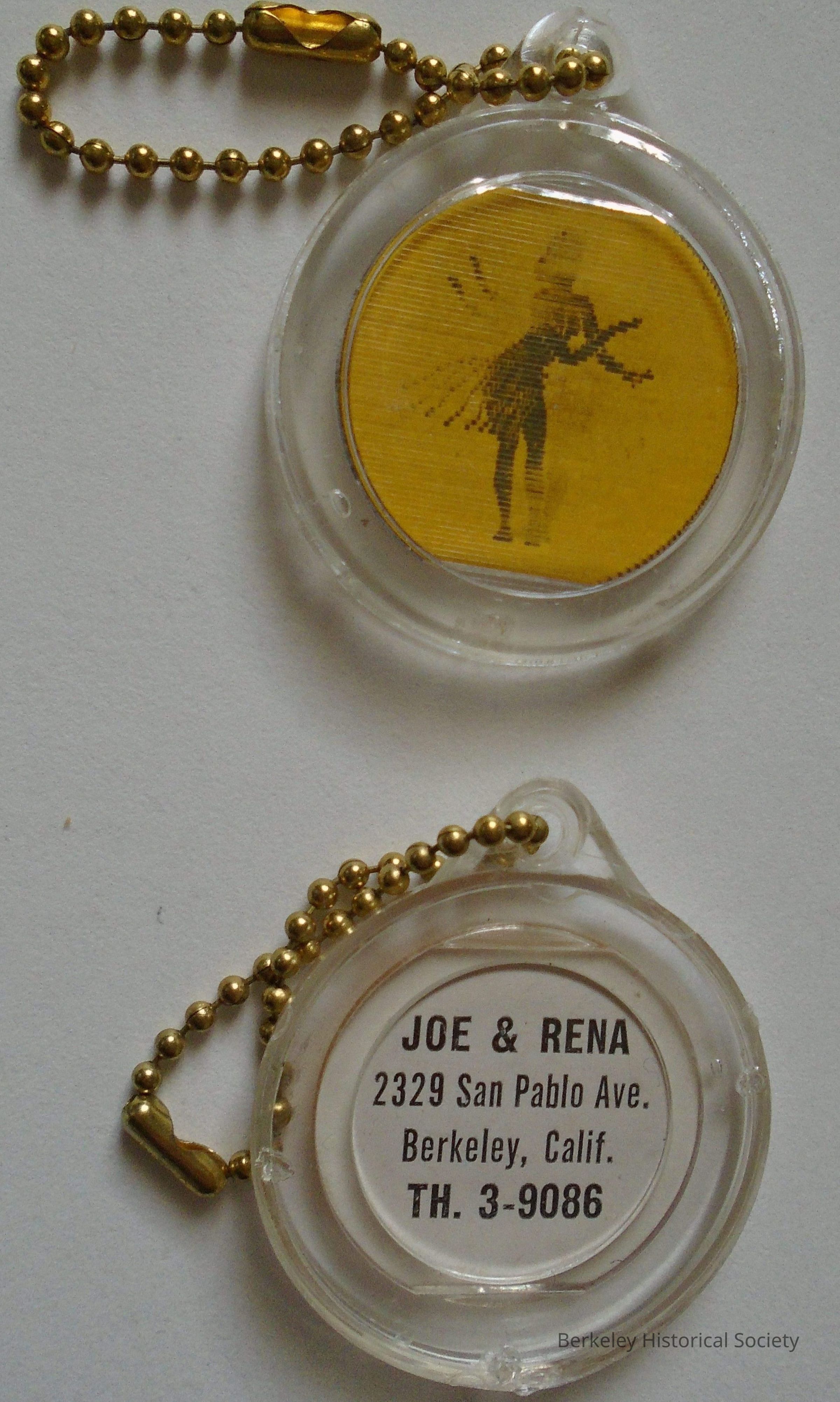 Joe & Rena (Palm Cafe) keychain with 2329 San Pablo Ave., Berkeley, Calif. TH. 3-9086 on one side. 1 of 4 keychains, each a different sport or picture; this one: a hula dancer. Moving the keychain changes the picture. Yellow paper in plastic, yellow metal chain. (Missing, not in A5-8).