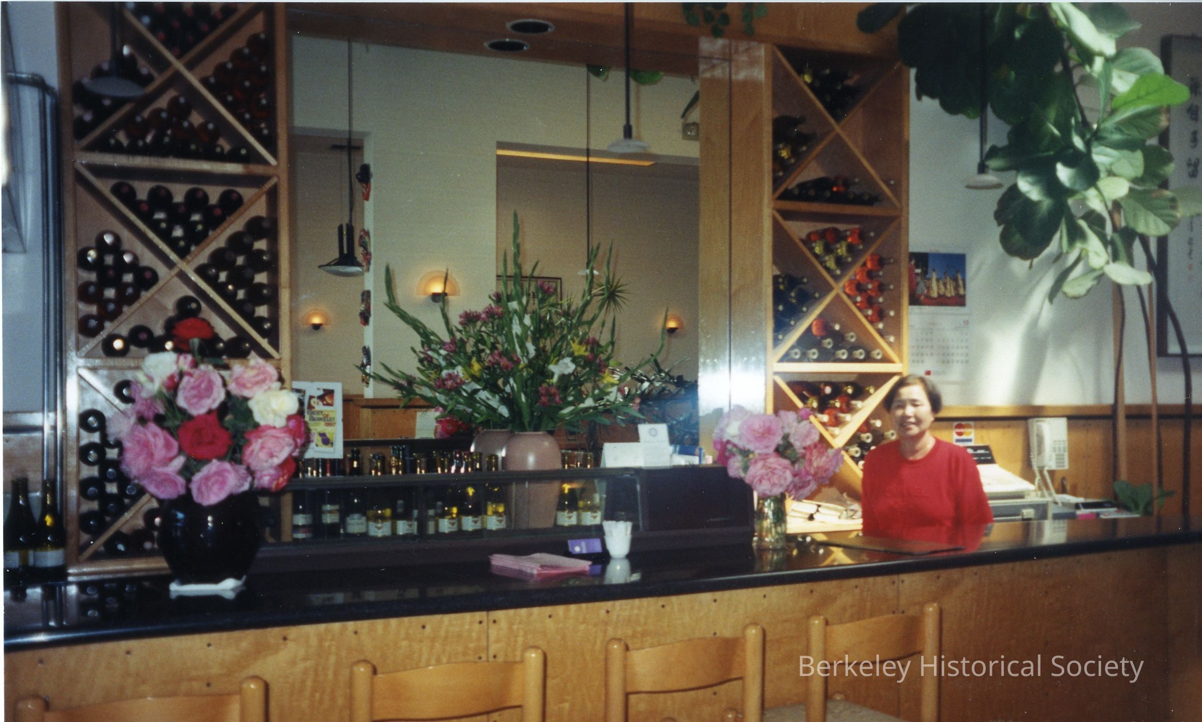 View of the bar with woman standing to the right behind bar.Other Names and Numbers