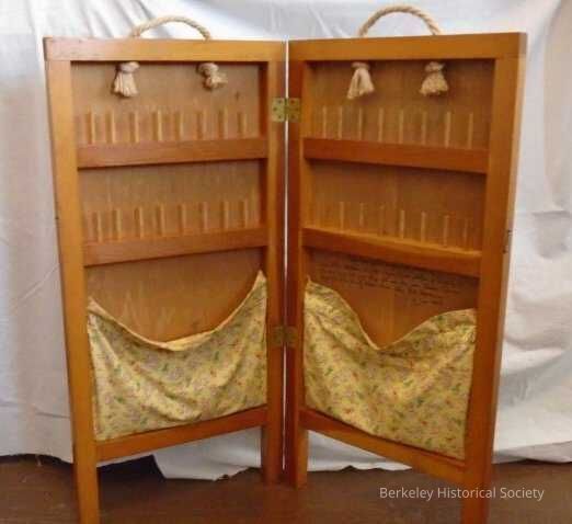 Folding wooden sewing kit. When open, sits on legs and has holders for thread at top and cloth pouches at bottom. Folds with a latch and has rope handles for carrying. From the estate of Ollie Abraham, an early Black resident of Berkeley. Inscription inside : died 1986 at the age of 88.