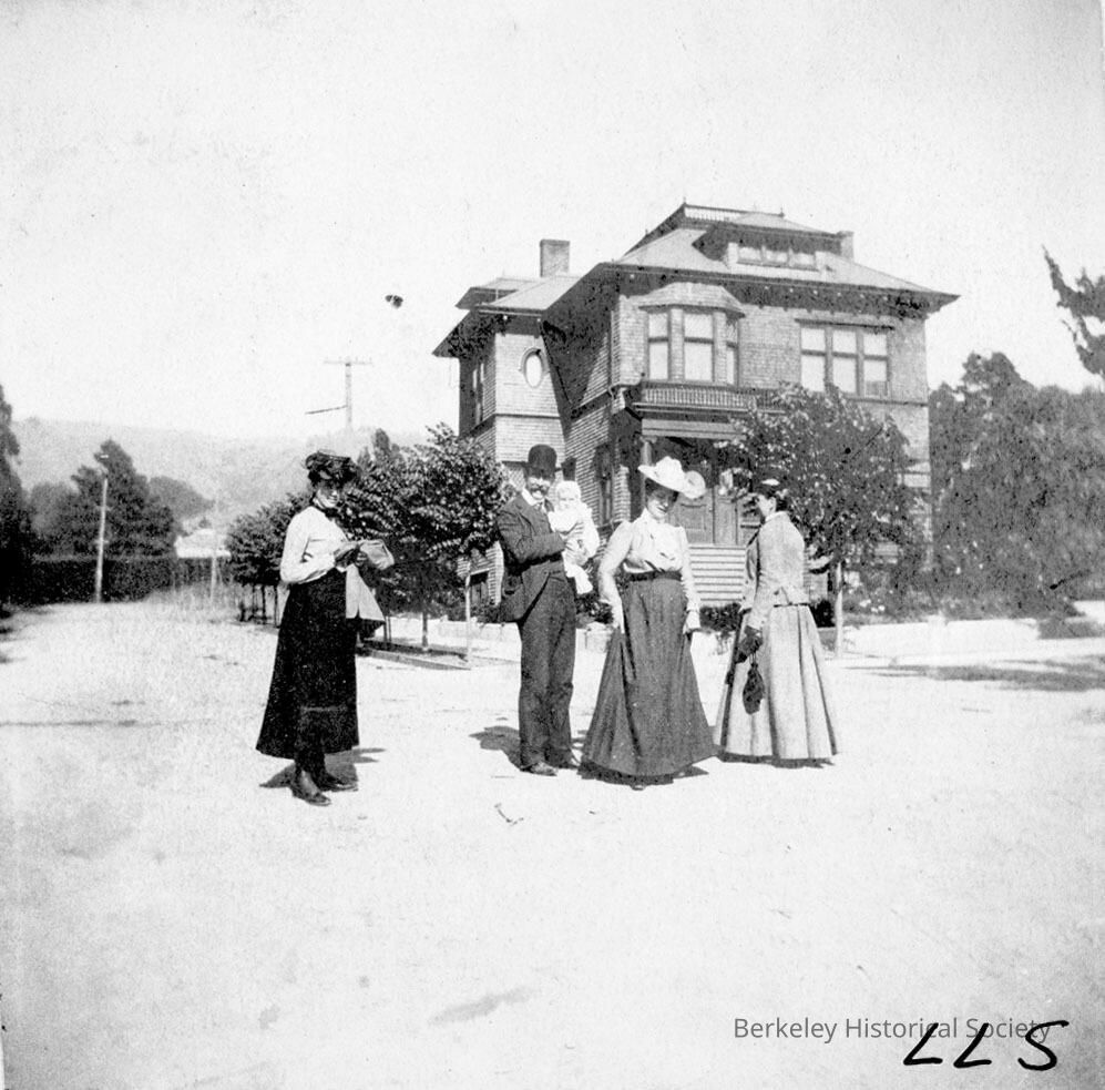 Frederick W. Koch family standing in front of Penniman house; three women, man holding small child. On verso: Henrietta and Betsy; Penniman house used at times as North Berkeley library and Live Oak Clubhouse. Directories list Penniman at 1301 Shattuck Avenue.Other Names and Numbers