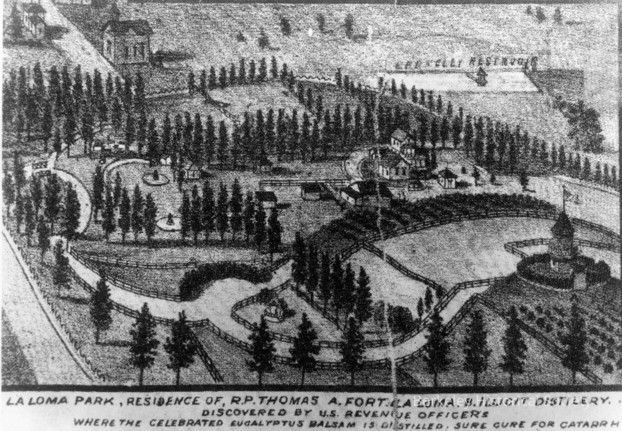 Photo copy detail of map drawing. "La Loma Park, residence of R.P. Thomas A. Fort La Loma B. Illicit distilery discovered by US Revenue Officers where the celebrated eucalyptus balsam is distilled. Sure cure for catarrh"