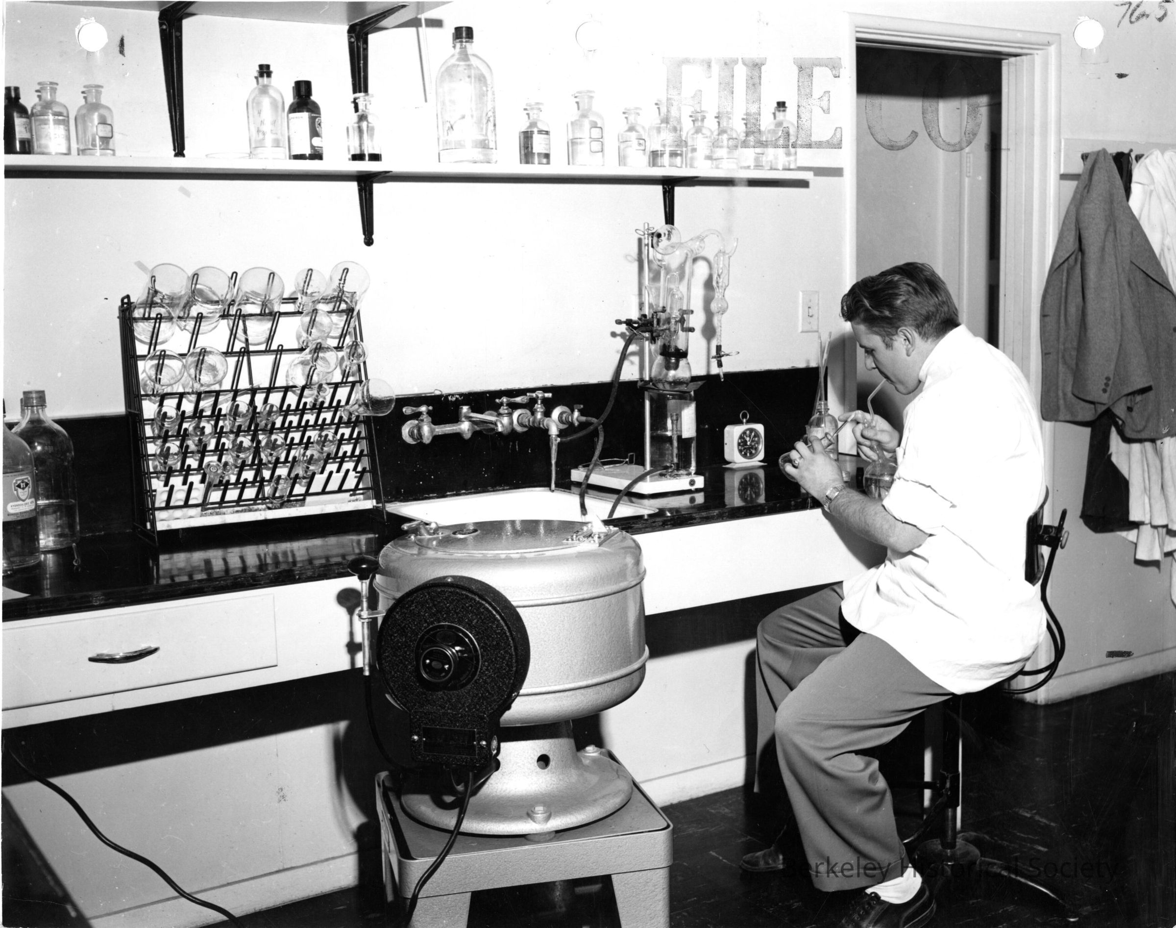 Lab technician seated at counter; Cutter Laboratories, 4th Street, corner Parker