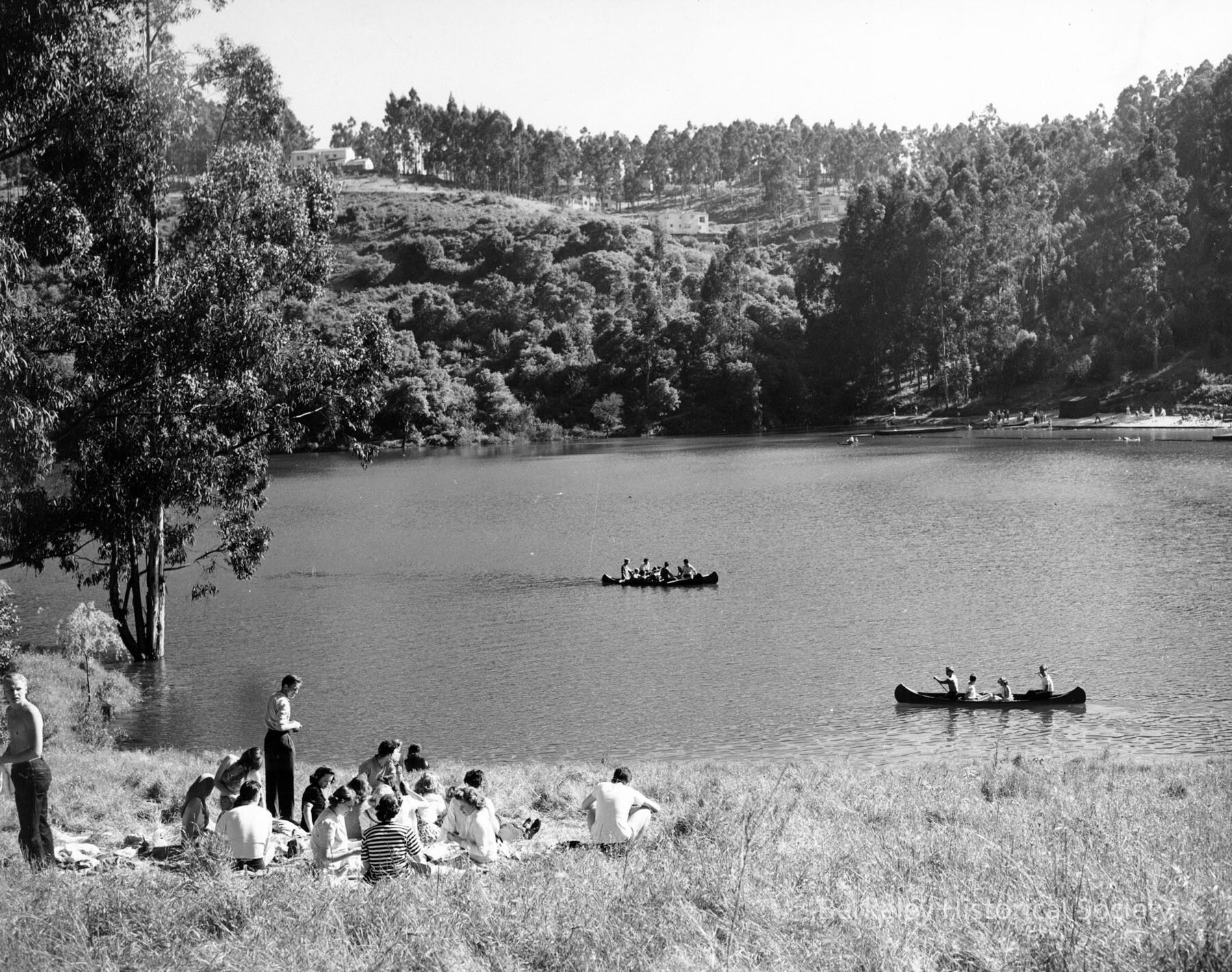 Picnicking group in foreground; canoes on lake.Other Names and Numbers