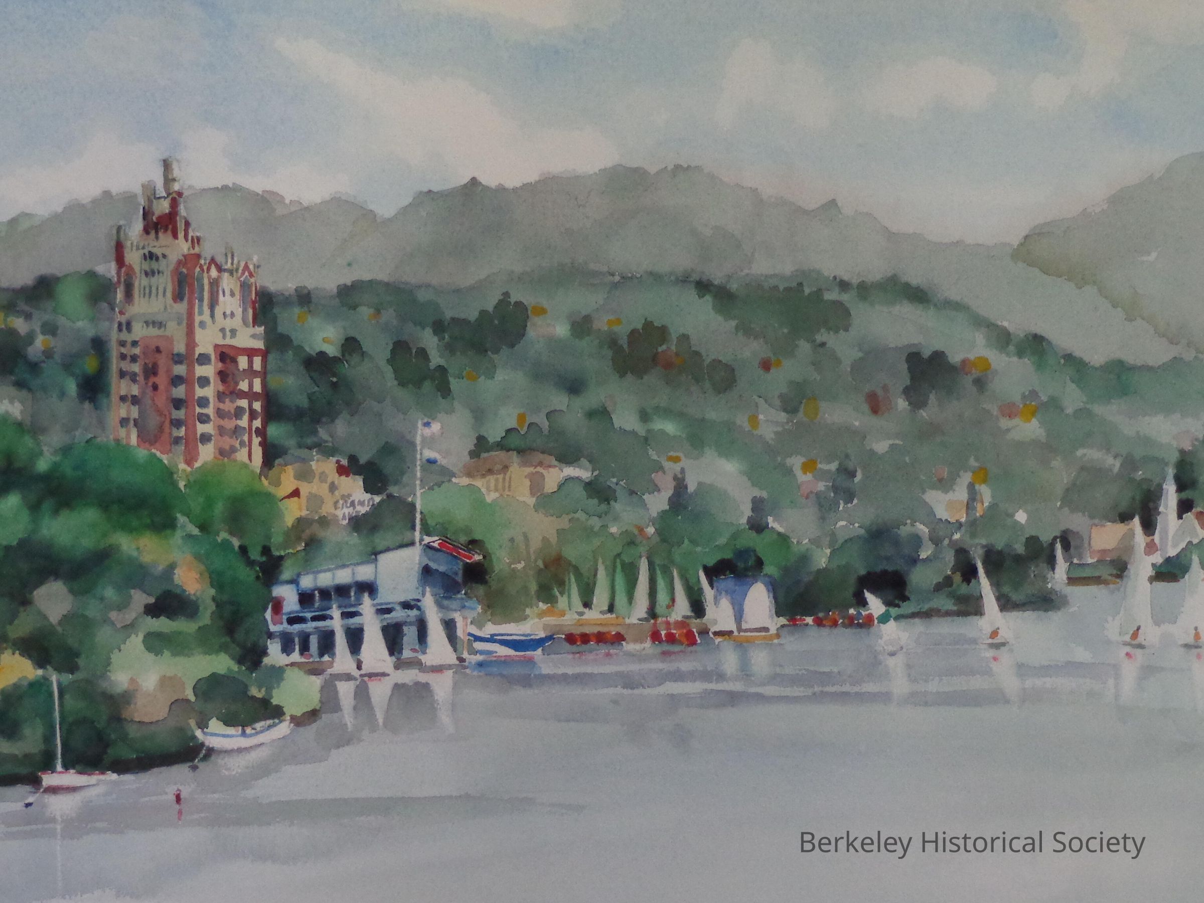 K. Y. Fong. Lake Merritt scene, sailboats on lake, Bellevue Staten apartment building, hills behind. Untitled, not signed.Made/Created