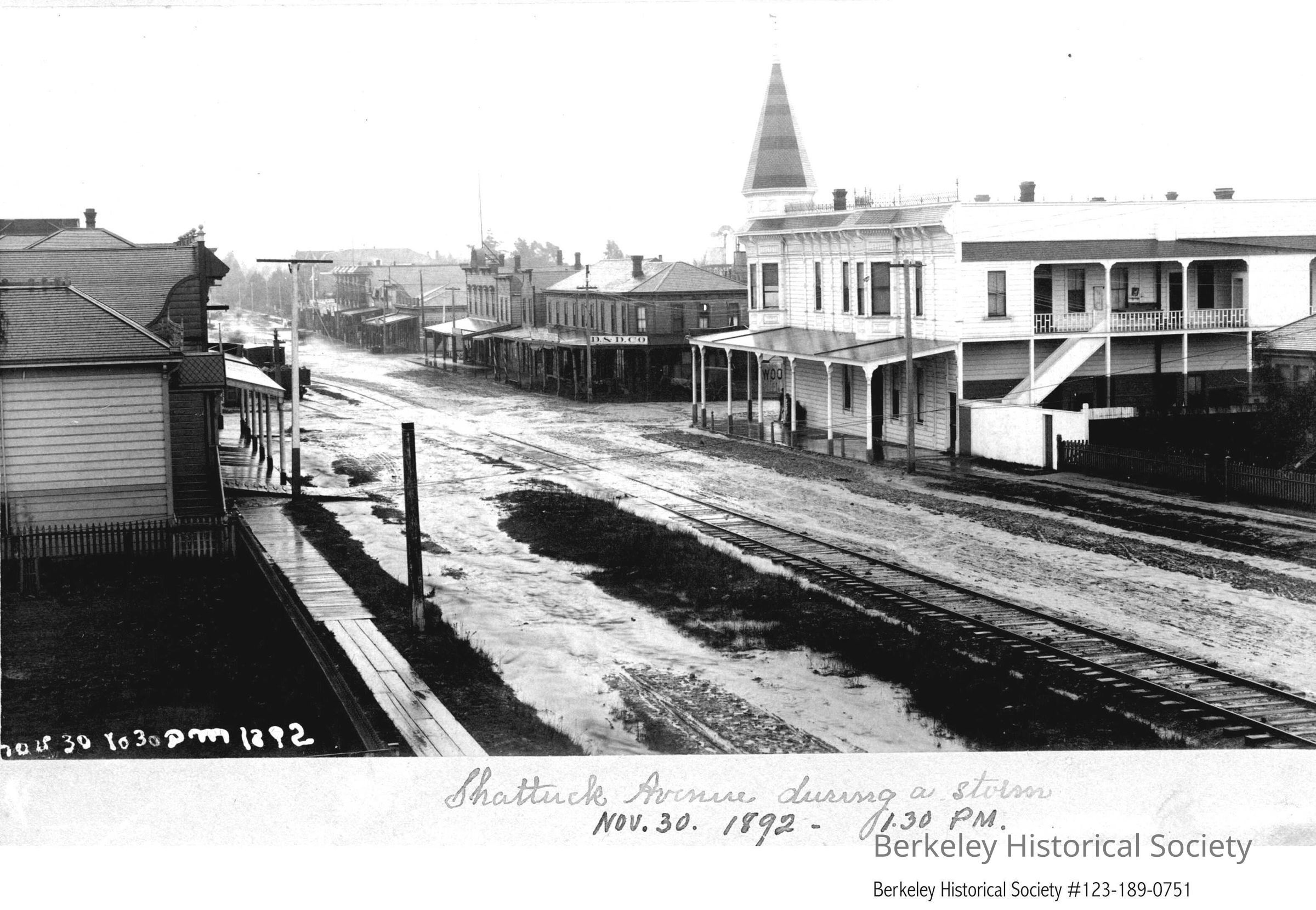 Landregan Hotel, Shattuck Ave & University, 1892. Below photo: Shattuck Avenue during a storm.