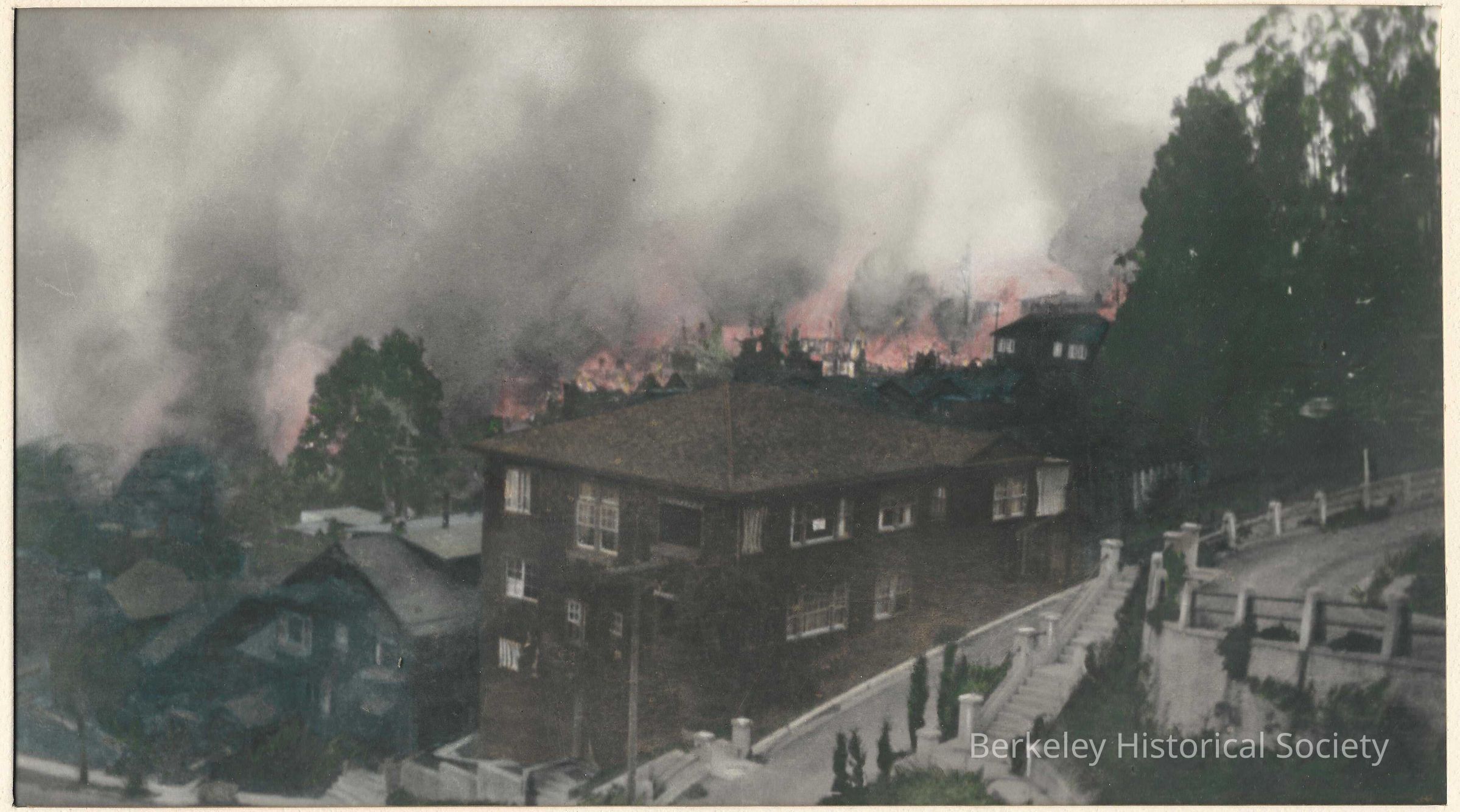 Large tinted photo panoramas of the Berkeley fire of 1923