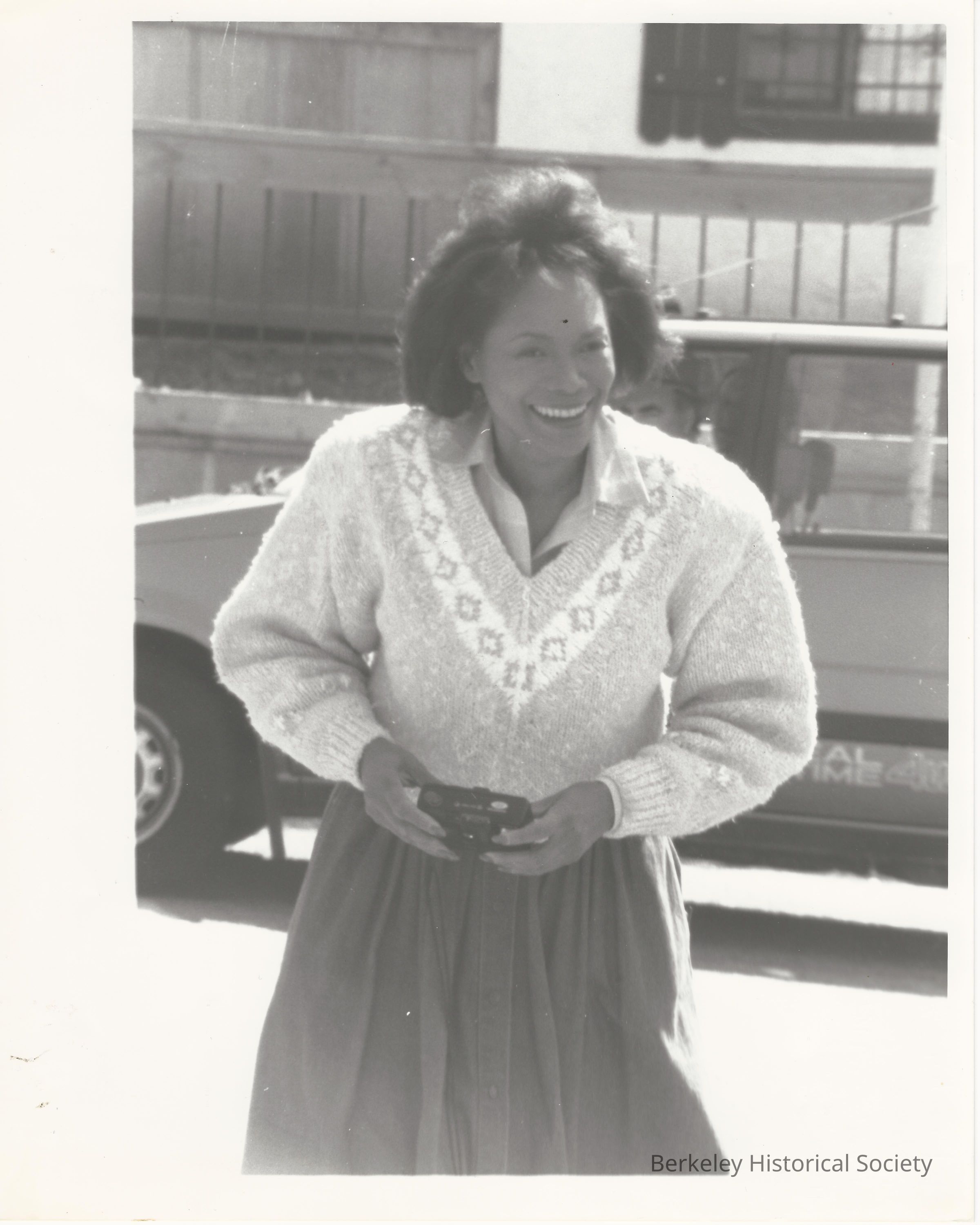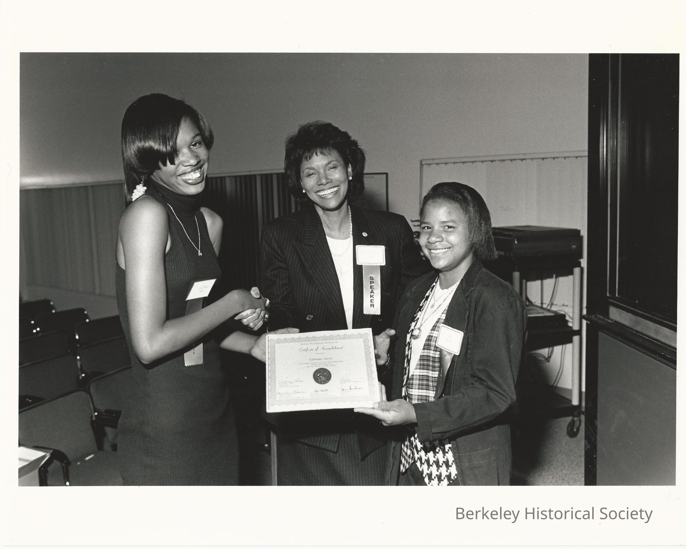 2 items. One being awarded certificate of achievement, with unidentified women; one showing excitement at Cal Alumni Association's work for Malcolm X School.Location