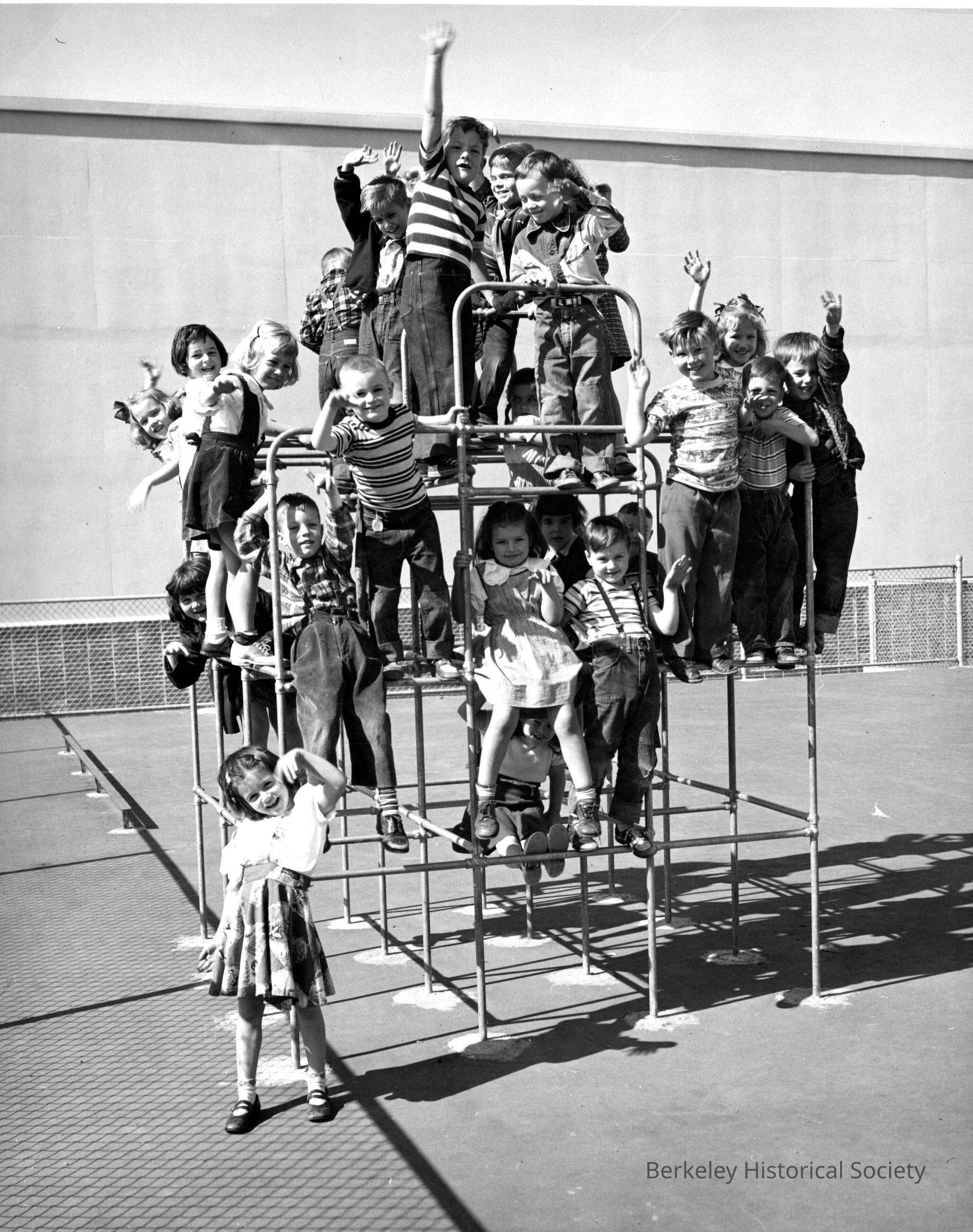 Several children on jungle gym, waving to the photographer.Made/Created