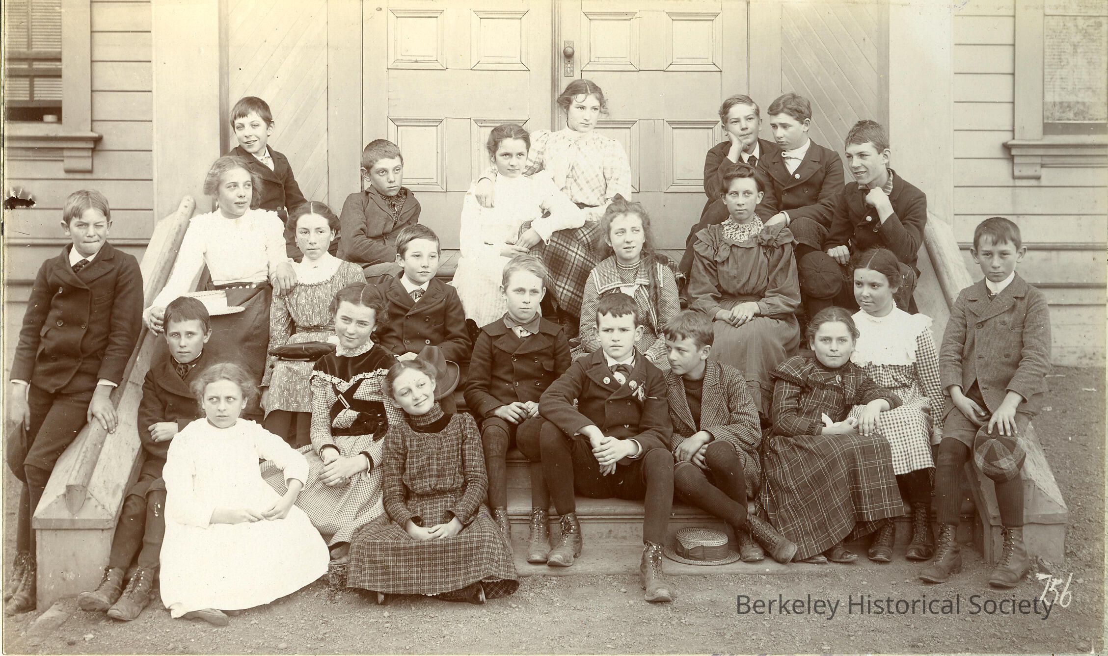 Class on stairs in front of a paneled door (possibly Le Conte Grammar school), boy standing on the left side off of the stairs; boy with shorts and black tights on the right side of the pictureMade/Created