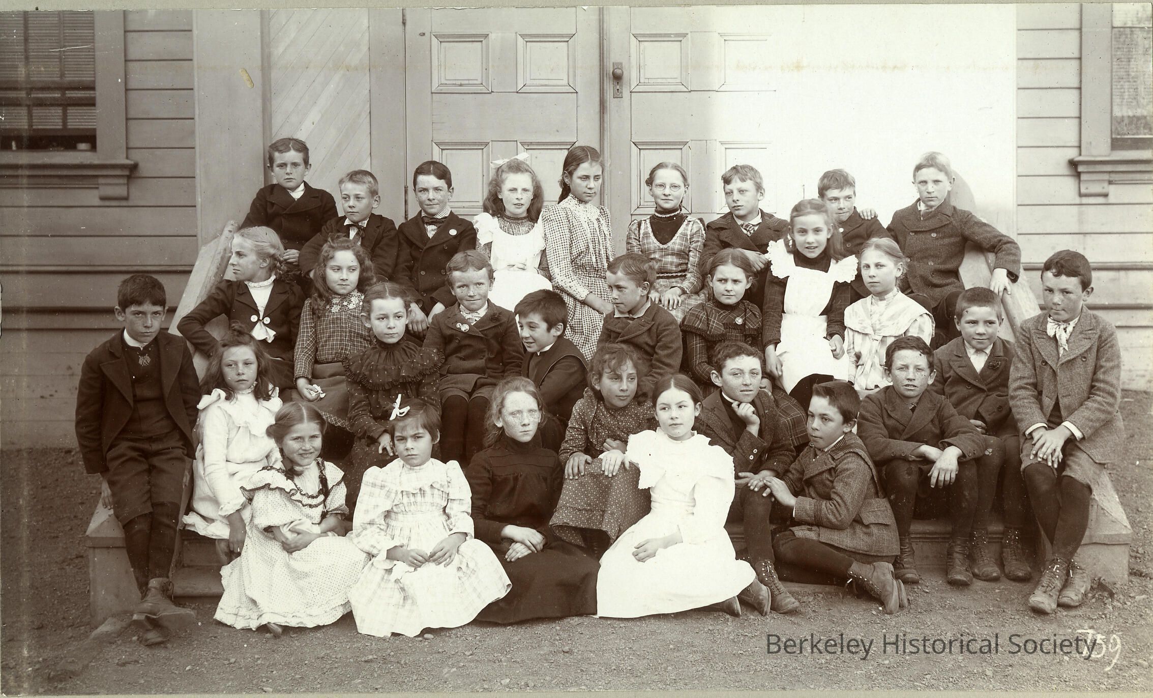 Class on stairs in front of a paneled door (older students), boy with short and black tights with legs crossed on the right side of the pictureMade/Created
