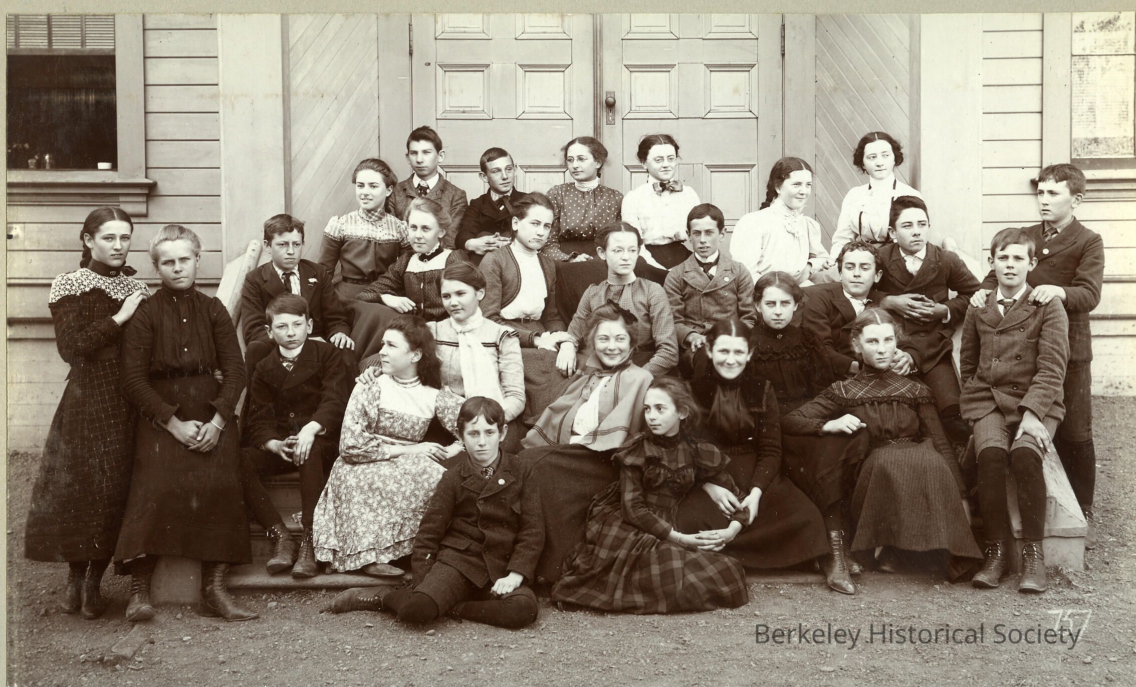 Class on stairs in front of a paneled door; a boy with short and black tights on the right side of the picture; two girls standing on the left side of the picture.Made/Created