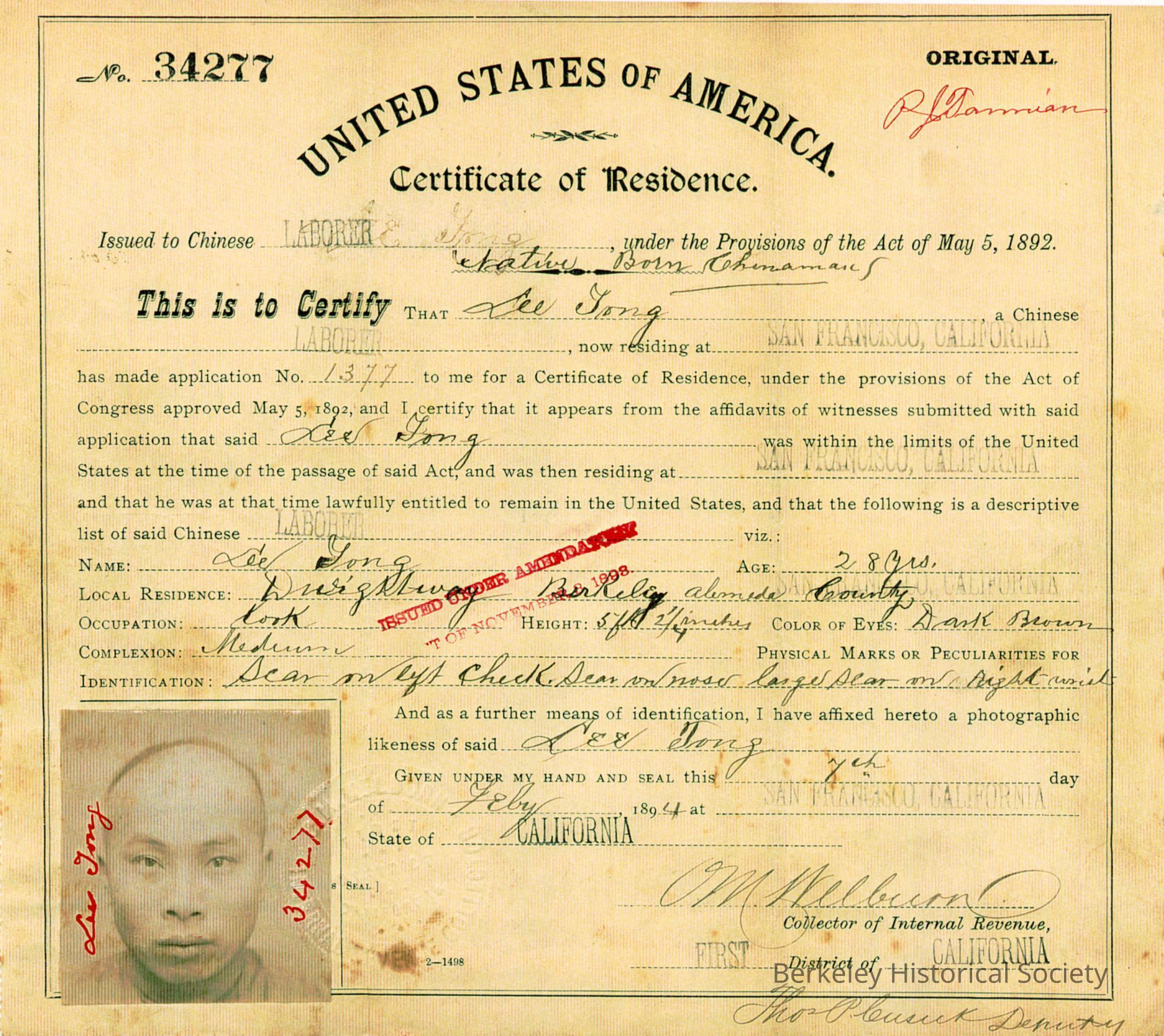 Certificate of Residence issued in 1894, indicating residence on Dwight Way, Berkeley, occupation as cook.Other Names and Numbers