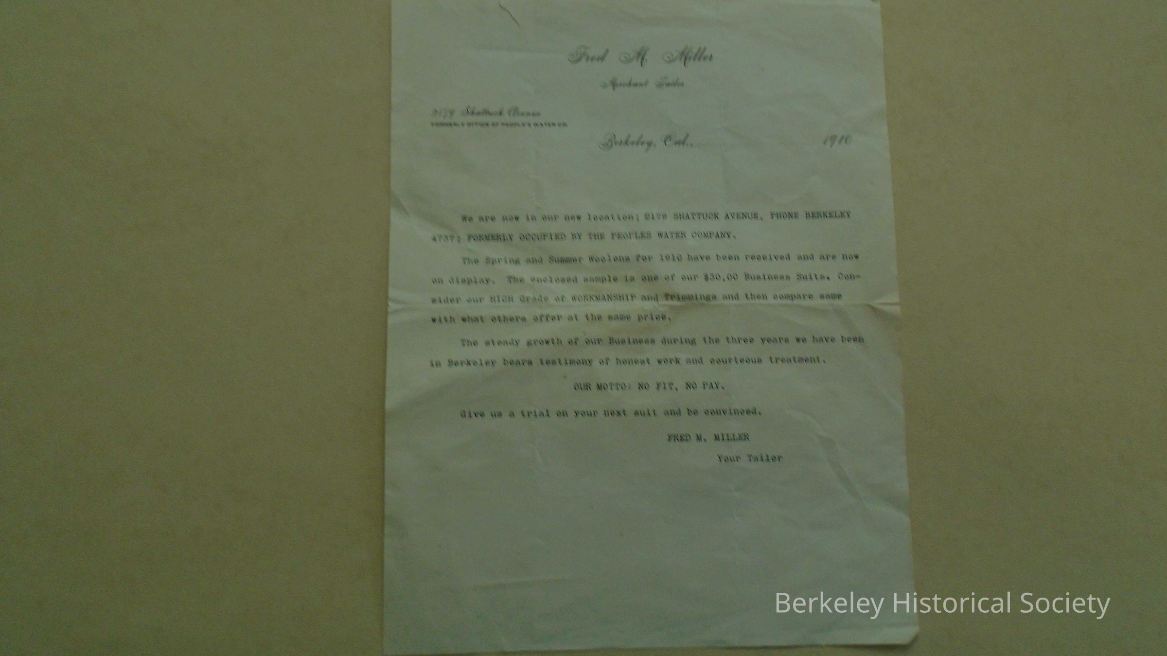 Paper business letter from Fred M. Miller, Merchant Tailor, advertising a new location and woolens for 1910. Location at 2179 Shattuck Avenue, Berkeley, Cal., 1910. Signed Fred M. Miller, Your Tailor. (Miller attended U.C. and is in the 1992 Blue and Gold as a Sophomore, from Grass Valley, to graduate in 1894).Lexicon