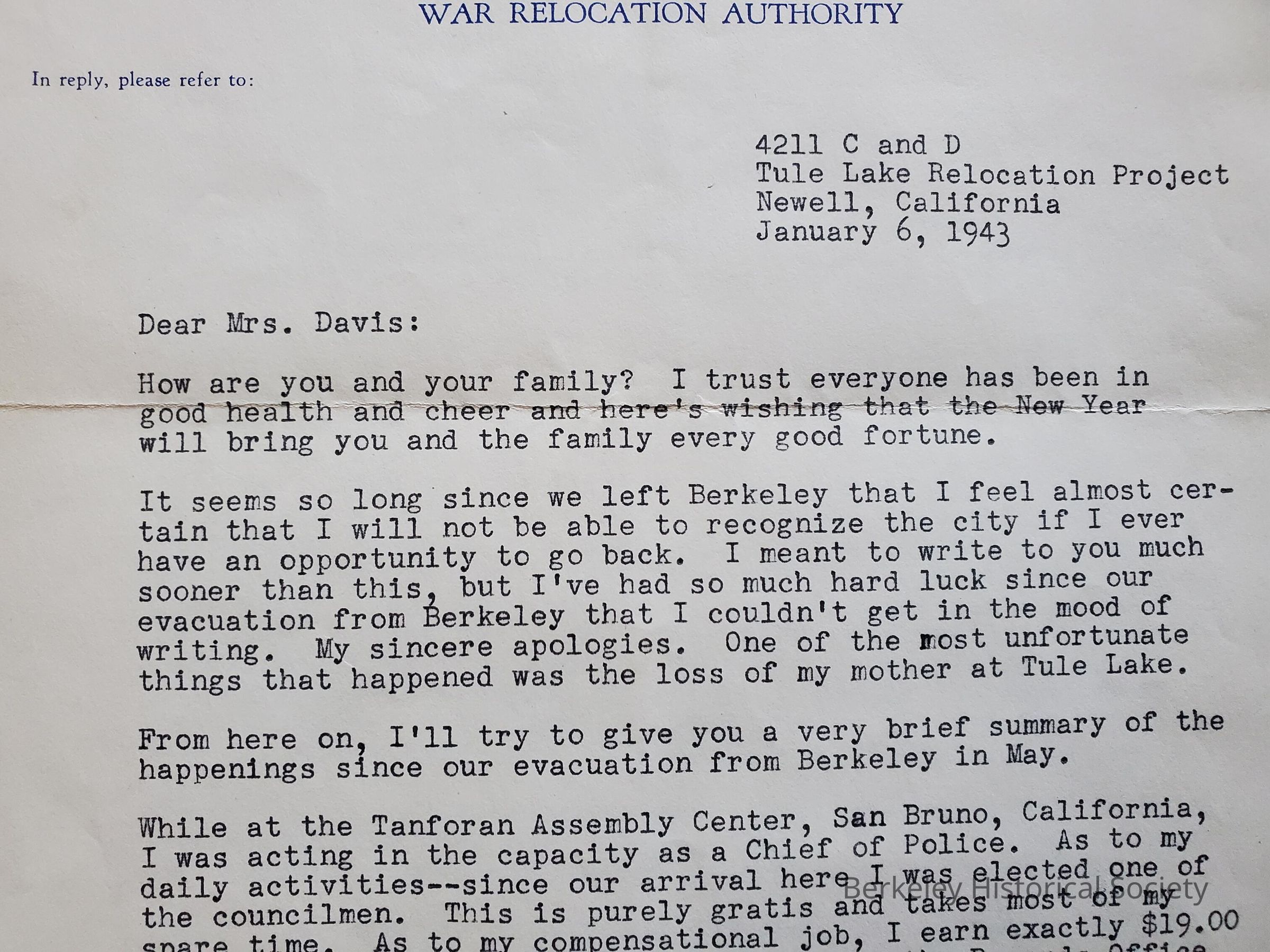 Letter written from Tule Lake Relocation Camp.. Tsukamoto had been the gardener to Davis before relocation. Describes his activities and positions he has held at Tule Lake, as well the organization of the camp and some of the facilities there.Lexicon