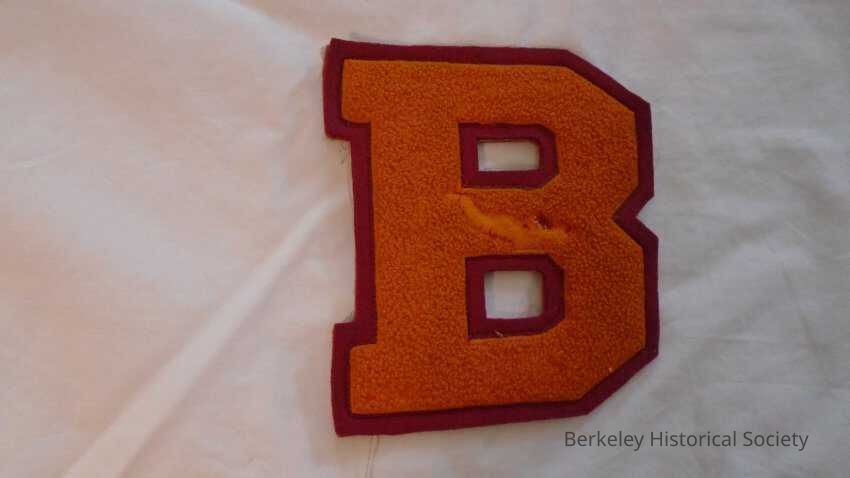 Felt and wool badge/letter "B" in orange and gold. Berkeley High letterman's badge. Cloth/cotton backing.