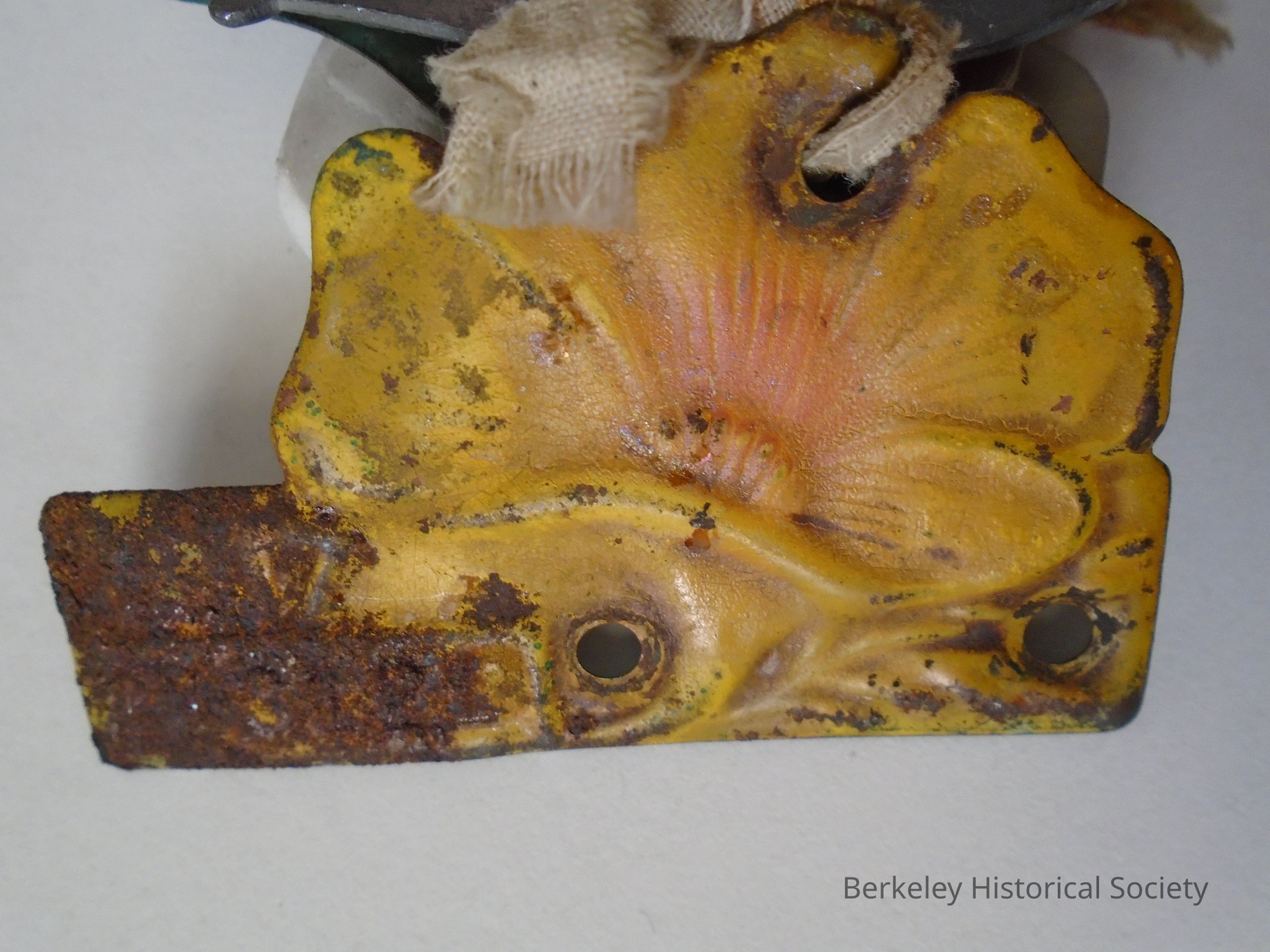 Metal license plate, probably for a bicycle, in the shape of a poppy and painted gold & yellow. Numbers rusted and hard to read. May be 1917 and 13121 visible. Rusty. 3 holes for screws. Tied with a ribbon to 2 other licenses (see 1995.002.030 & 1995.002.032).