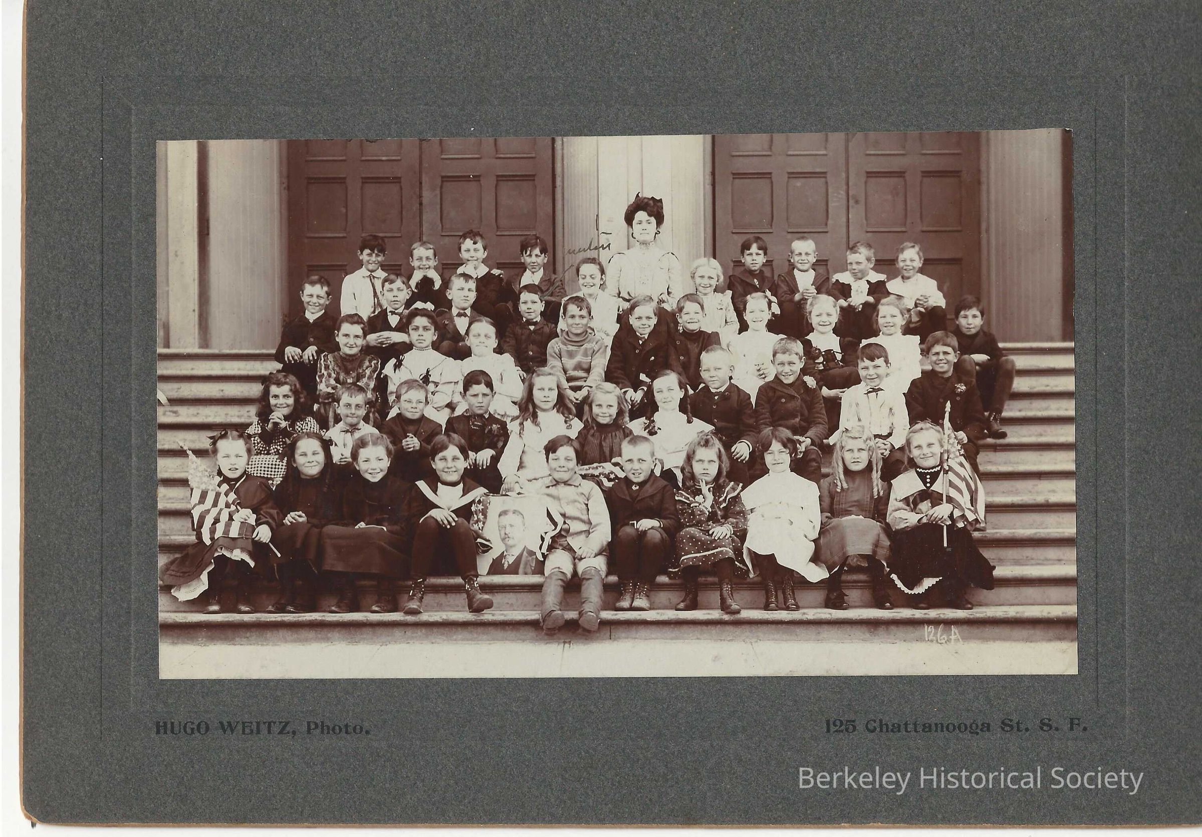 Class sitting on steps of school. Merten Berkeley Baker identified