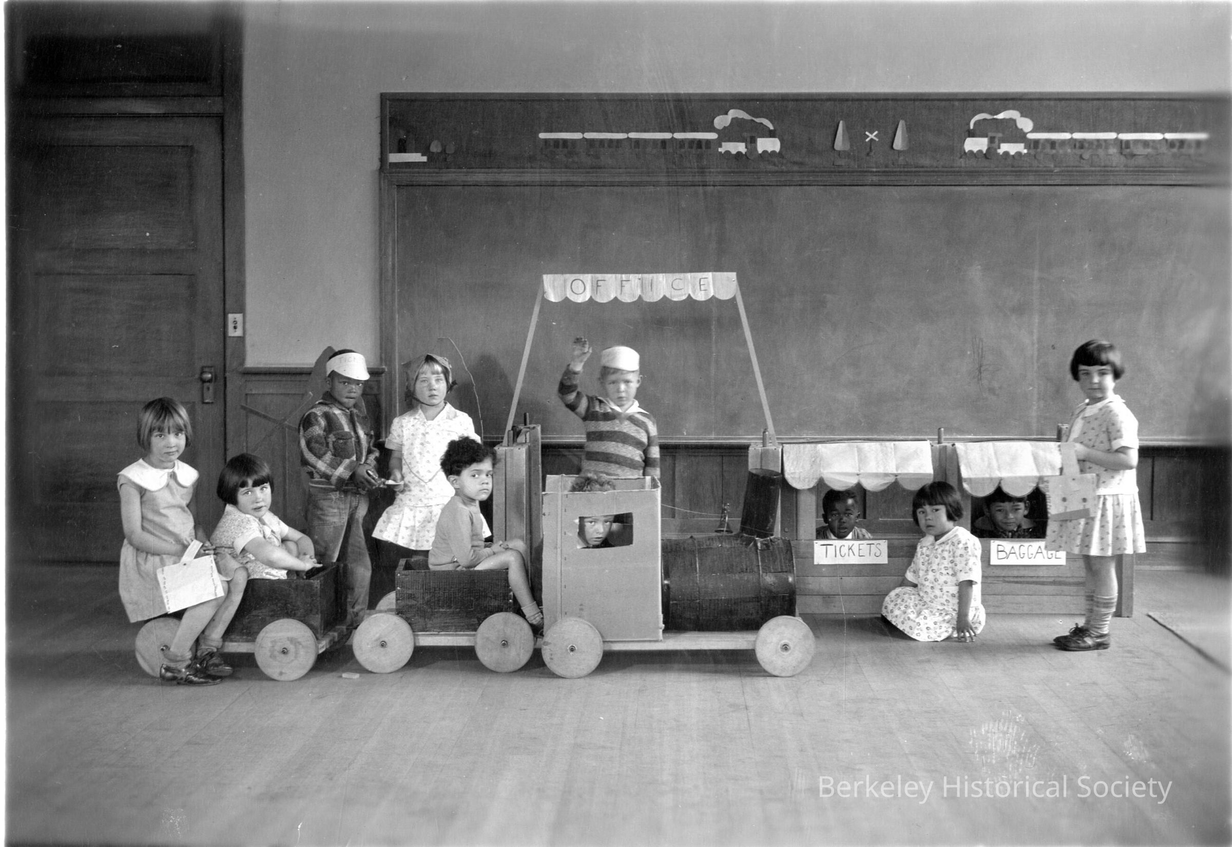 School children in wooden train; small structure labeled 'tickets.'Other Names and Numbers