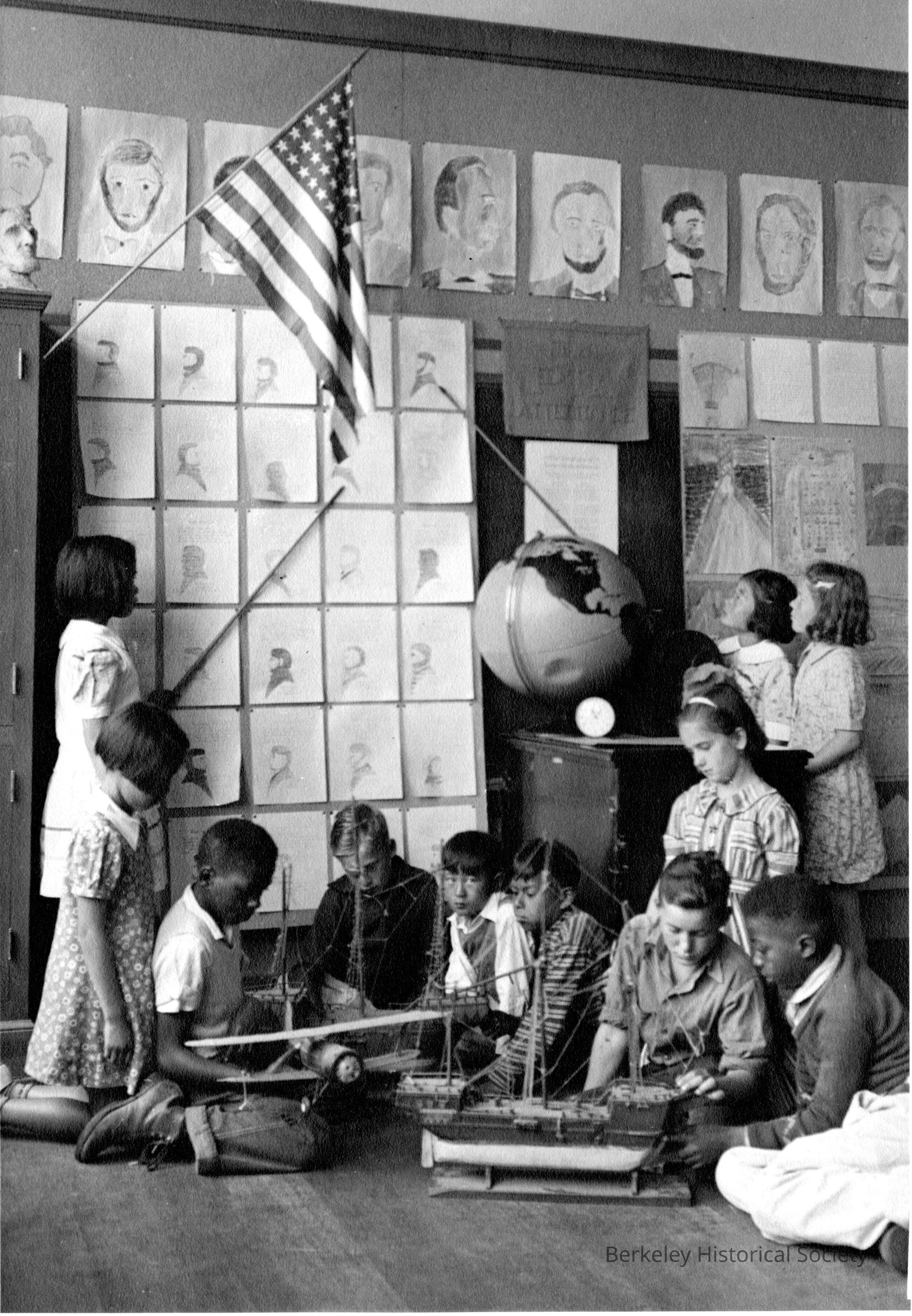 Girls with pointers showing drawings of historical figures; boys on floor examining model ships and planes.Other Names and Numbers