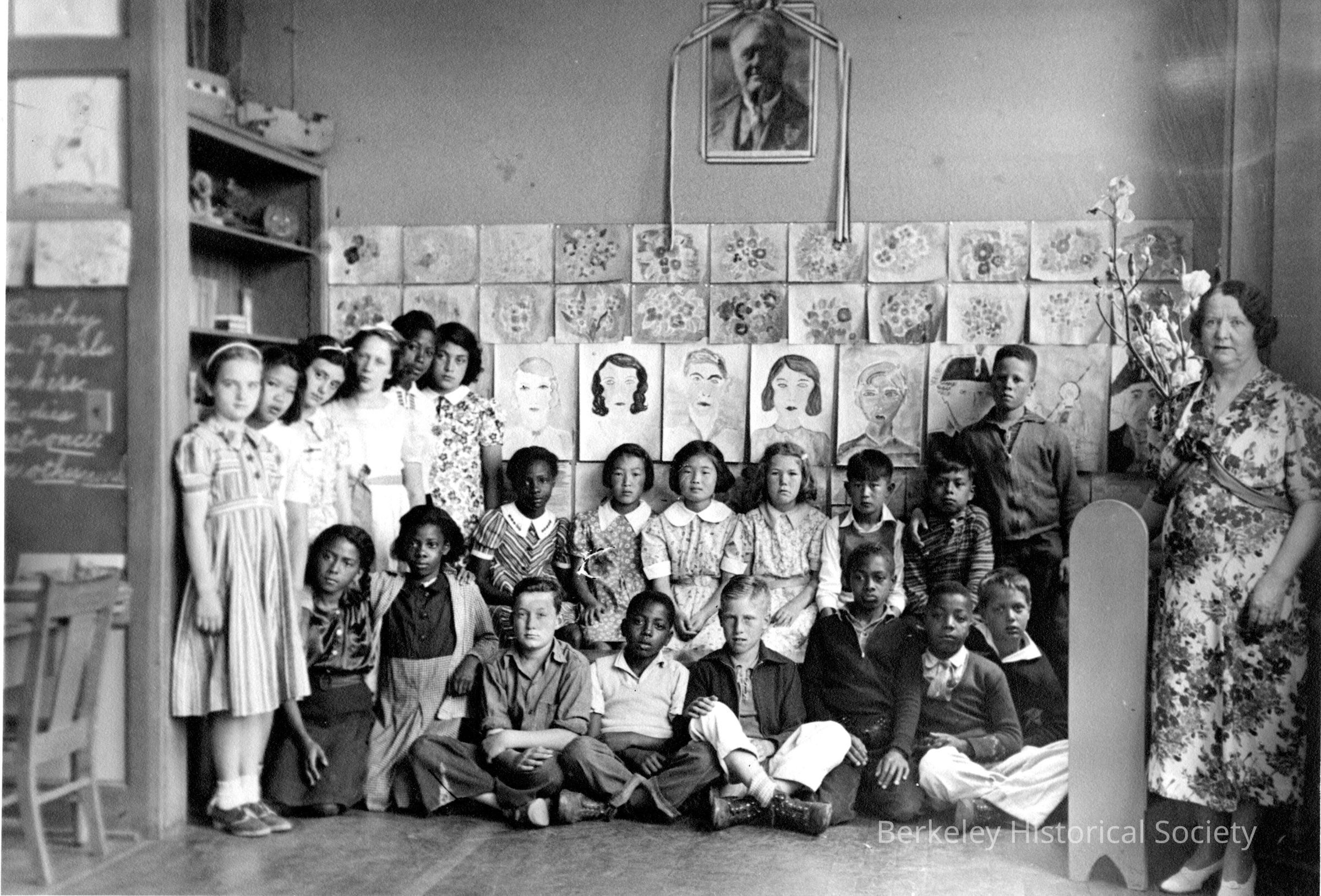 Students seated and standing in front of art projects on the wall. Teacher, standing at the right, is probably Cecilia McCarthy.Other Names and Numbers
