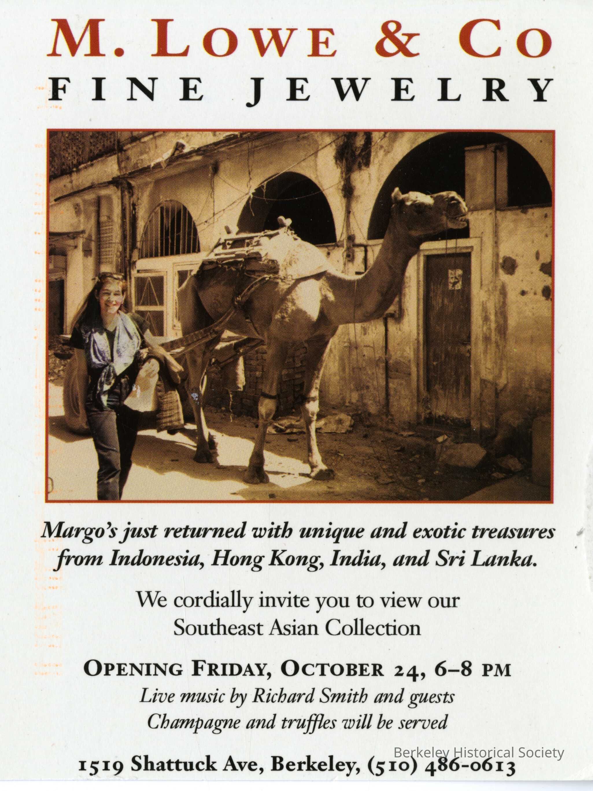 Postcard advertising new South Asian items at M. Lowe & Co. Fine Jewelry. Stamp and postmark present. 1519 Shattuck Avenue.
