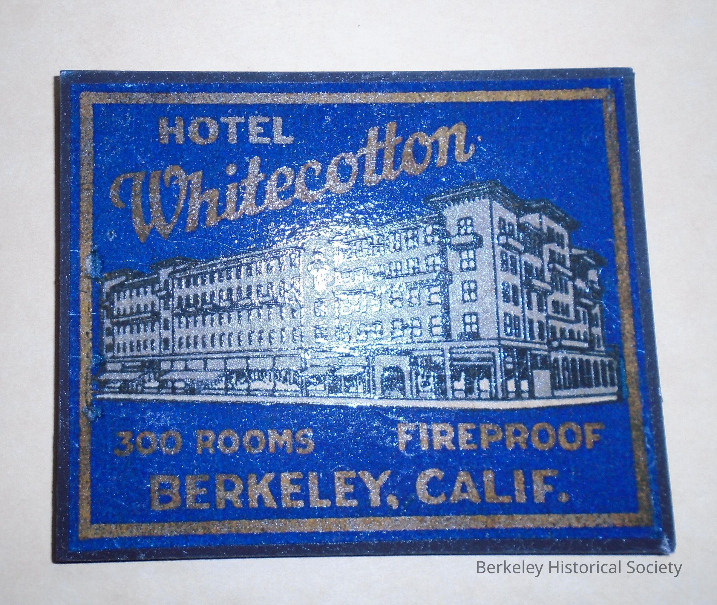 Blue and gold plastic magnet. Text : "Hotel Whitecotton, 300 rooms, Fireproof, Berkeley, Calif." and picture of hotel. (picture and text are a reproduction). Magnet may have been made by BAHA.