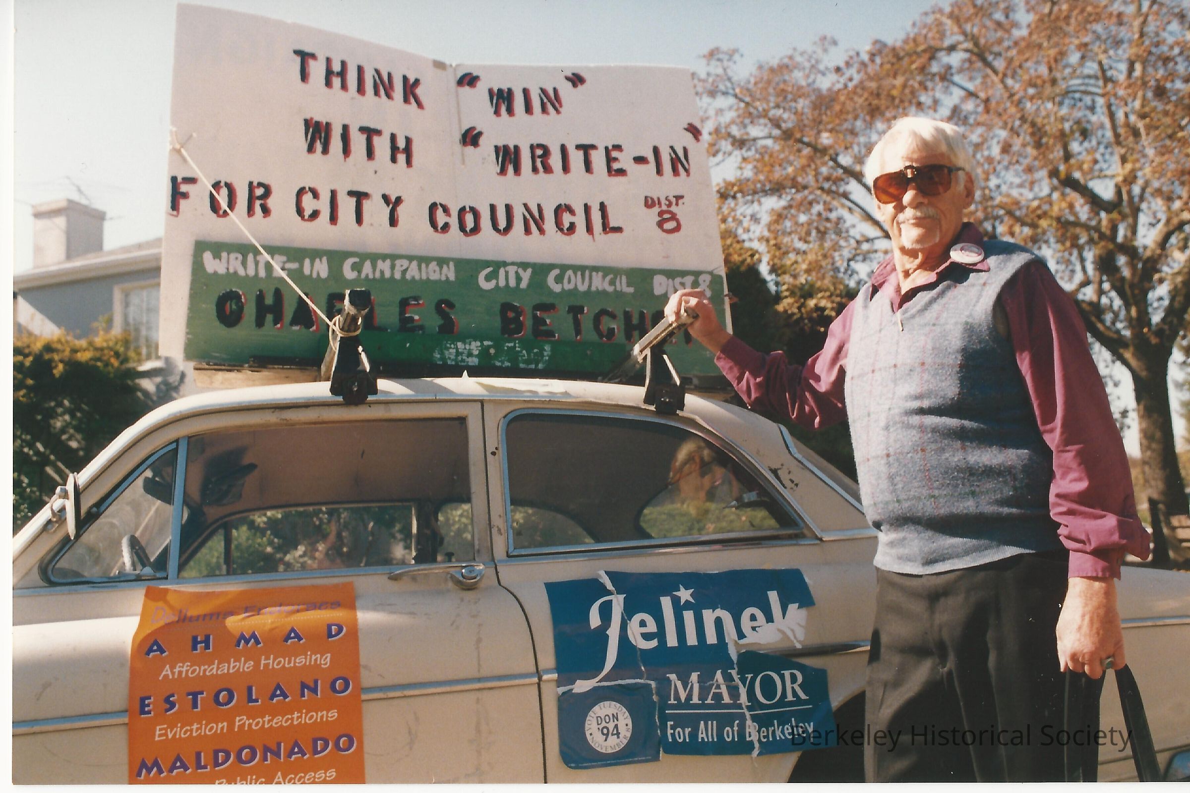 Charles Betcher alongside car with sign on roof: Think 'Win" with 'Write-in' for City Council, for District 8. On side of car: posters for Jelinek for mayor and also a rent board slate.